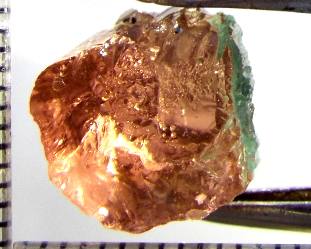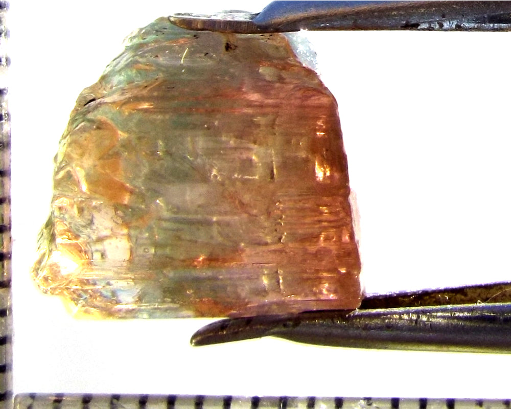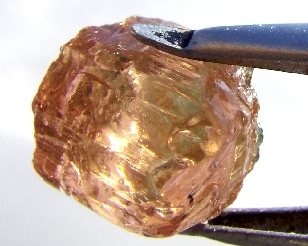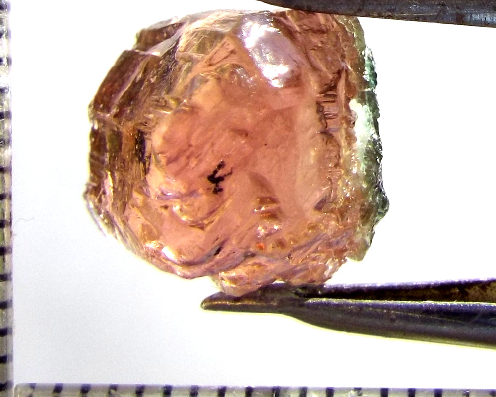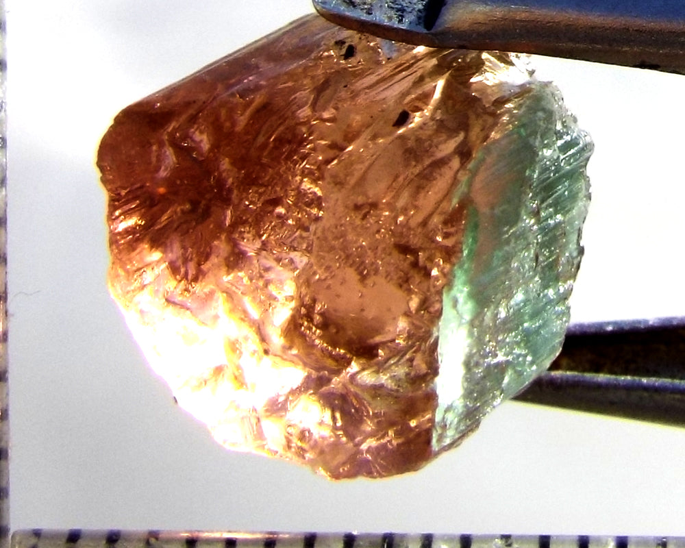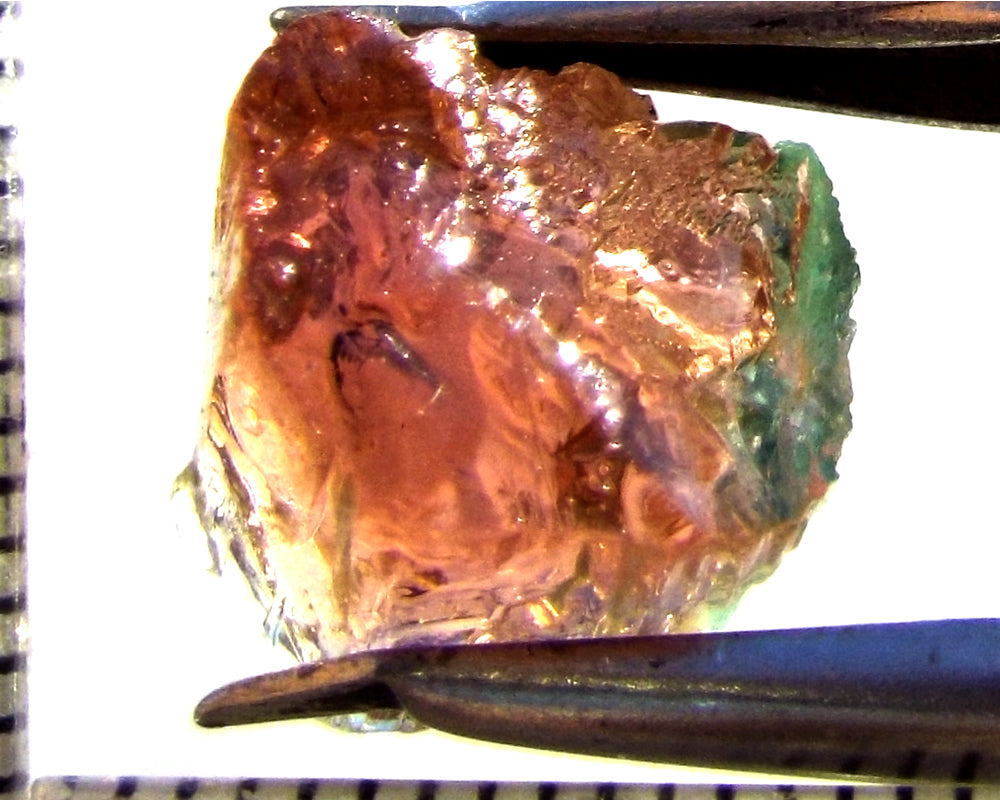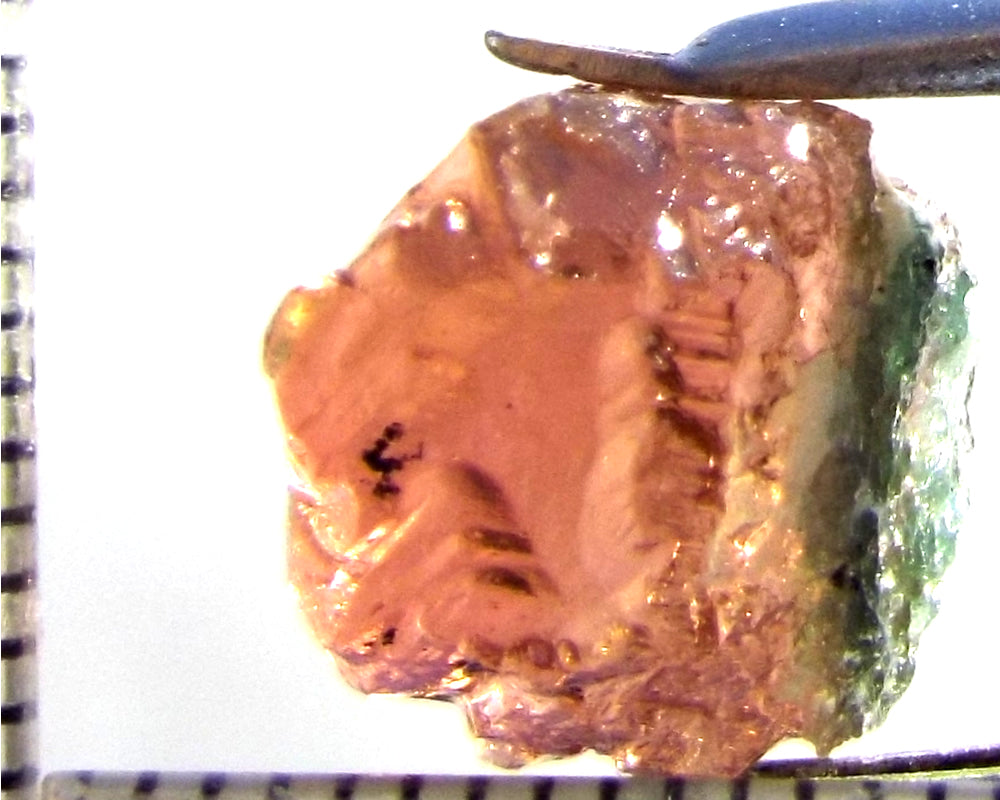 A bright, light, slight bicolour orange-pink to green stone from Mozambique, showing a darker orange-pink 'C' axis.
