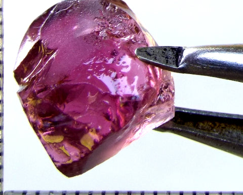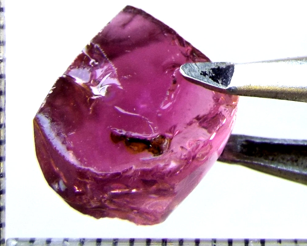 Tourmaline – Nigeria – 10.58 cts - Ref. TOB-574 A bright medium-strong pink stone from Nigeria, showing a slightpurple hue with a deeper pink 'C' axis. Graded AAA and weighing 10.58cts. Priced at just $10.00 per carat, a total of $106.00 The scale shown is in millimetres Now beat that for value!