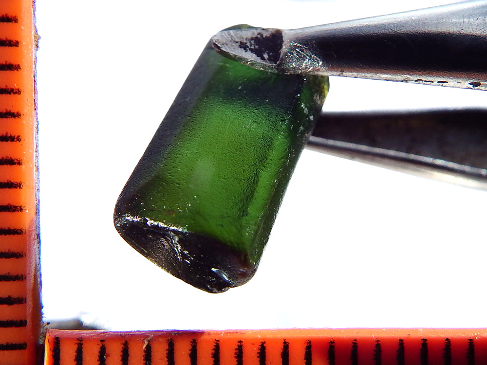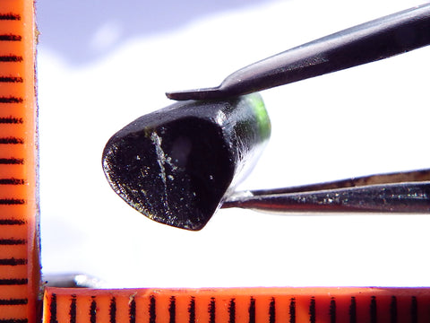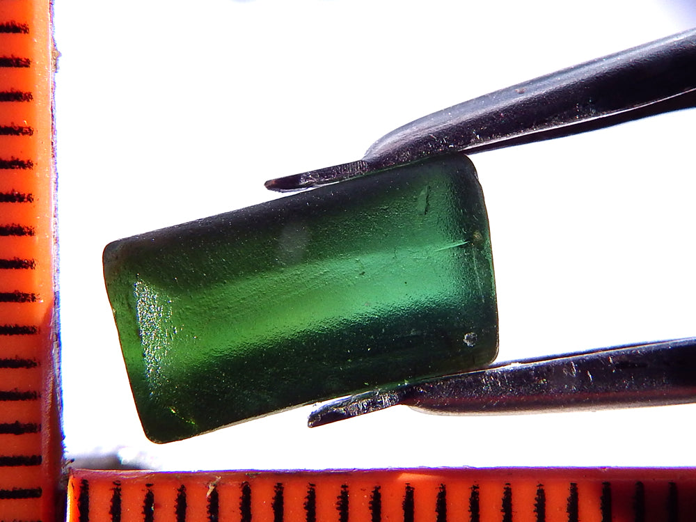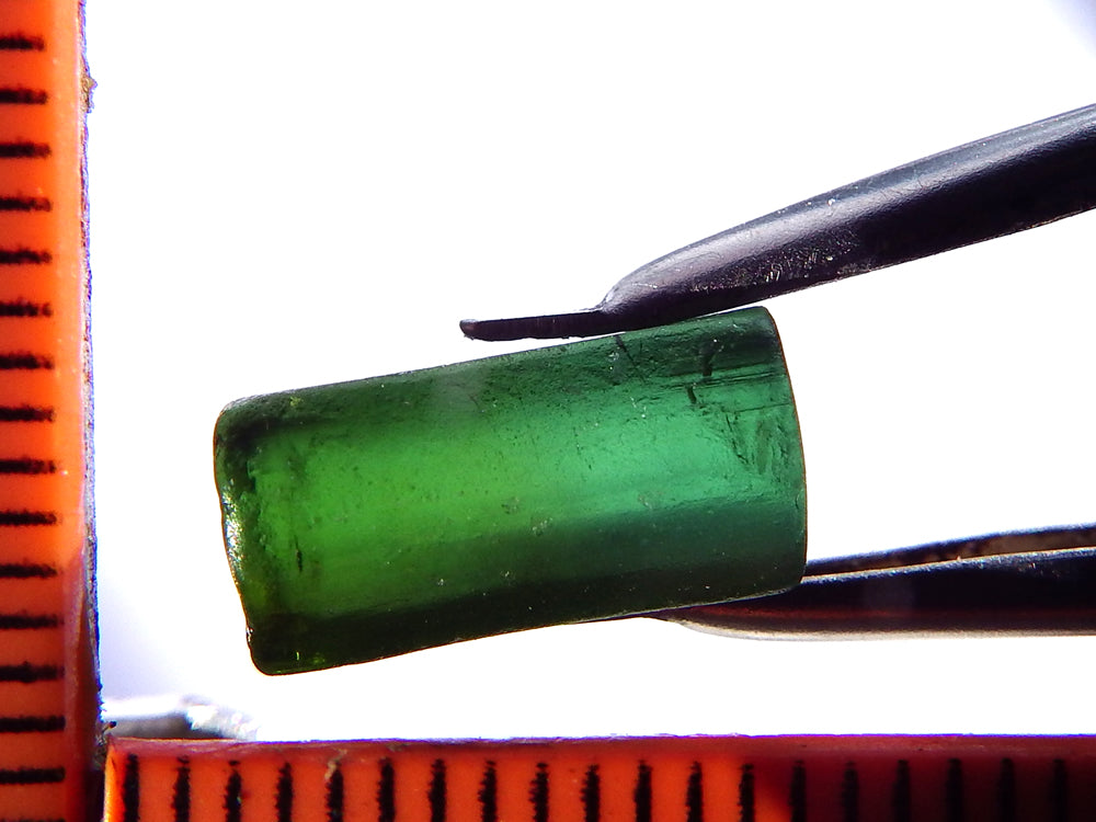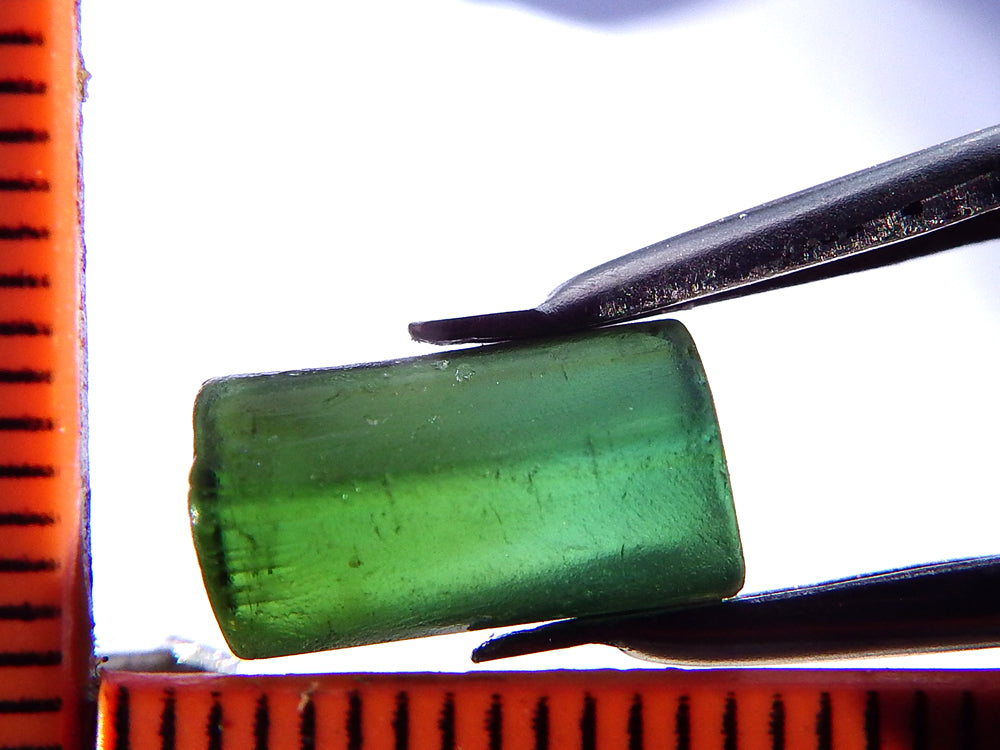 Tourmaline – Nigeria – 6.62 cts - Ref. TOB-319 A bright medium-light green stone from Nigeria, closed 'C' axis. Graded AAA and weighing 6.62 cts. Priced at just $7.00 per carat, a total of $46.00 The scale shown is in millimetres Now beat that for value!