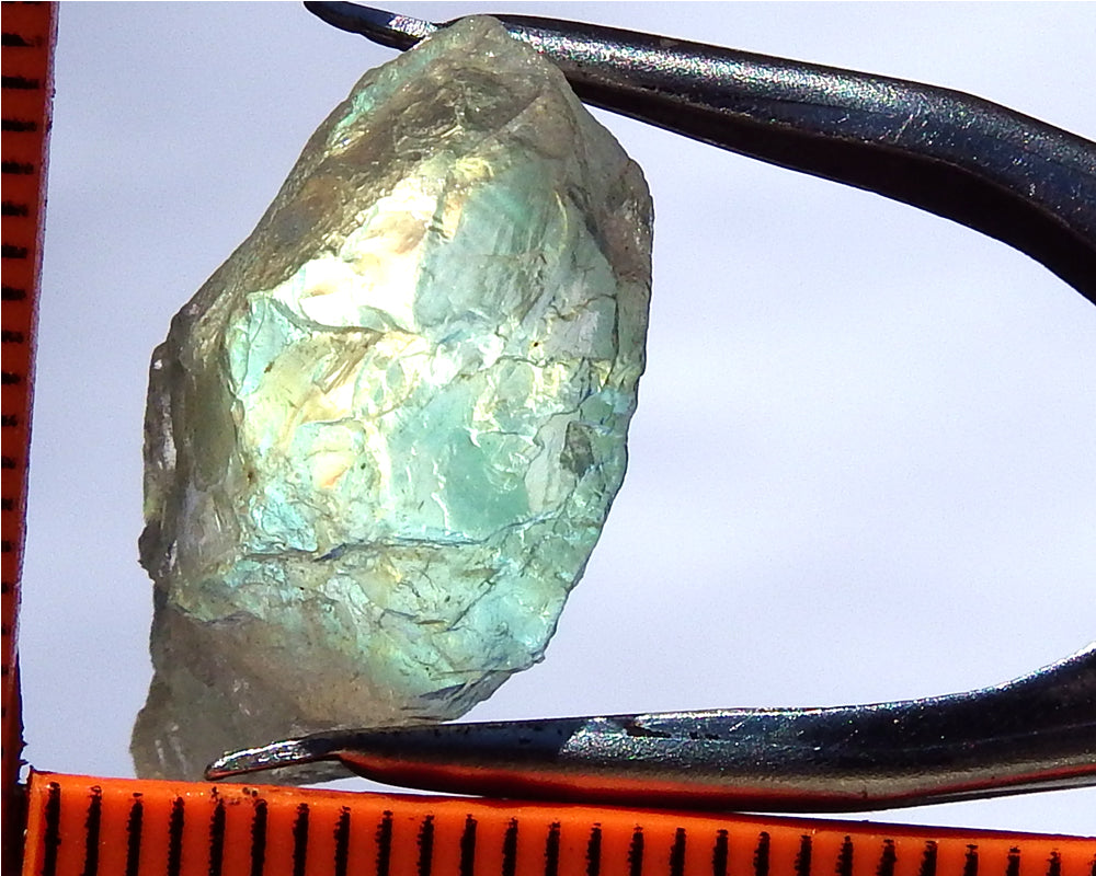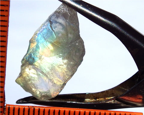 A rare, clear, colorless form of Labradorite from Tanzania weighing 18.09 cts and showing a great iridescence.