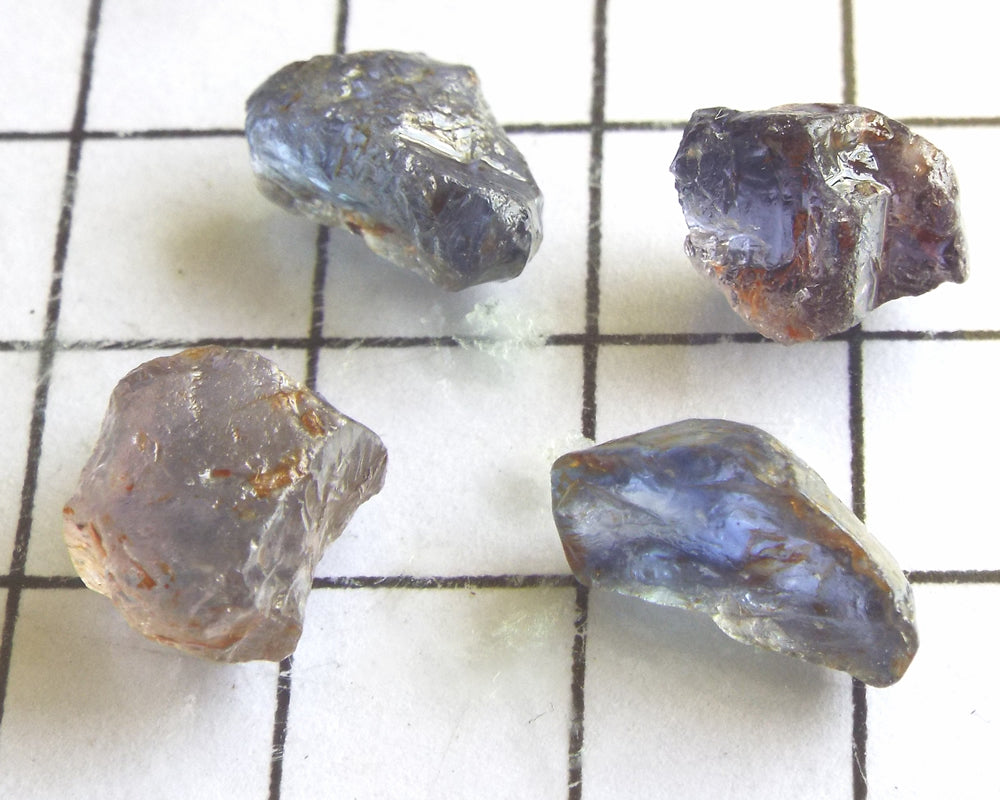 A mixed parcel of Umba Sapphires from Tanzania. The Umba stones are unique in the range of colours shown, usually in the blue to purple range sometimes pink and green. They not only show a strong dichroism - that is, they show two distinct colours - many, but not all, of the Umba Sapphires also show a strong to medium 'colour-change' depending whether they are observed in daylight or incandescent light. It is this phenomena which makes they extremely difficult to photograph as usually the camera picks up the color-change shown in incandescent light.