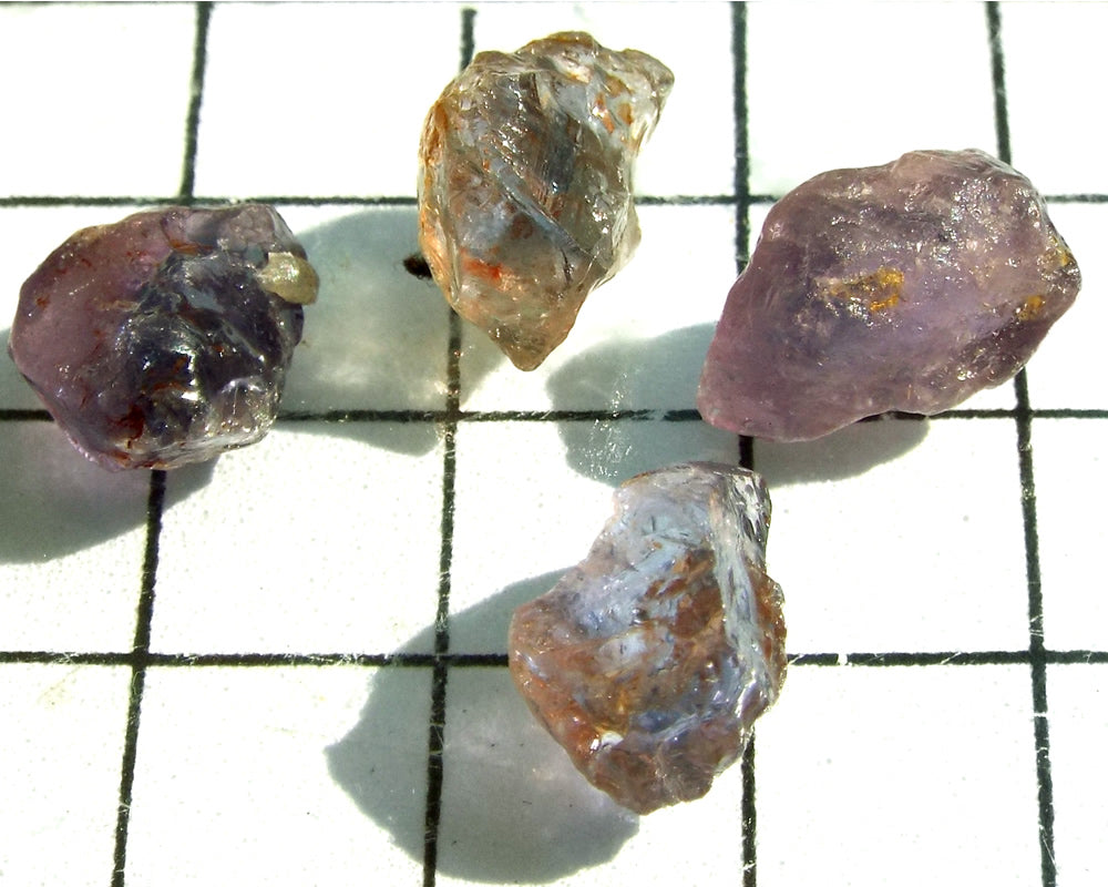 A mixed parcel of Umba Sapphires from Tanzania. The Umba stones are unique in the range of colours shown, usually in the blue to purple range sometimes pink and green. They not only show a strong dichroism - that is, they show two distinct colours - many, but not all, of the Umba Sapphires also show a strong to medium 'colour-change' depending whether they are observed in daylight or incandescent light. It is this phenomena which makes they extremely difficult to photograph as usually the camera picks up the color-change shown in incandescent light.