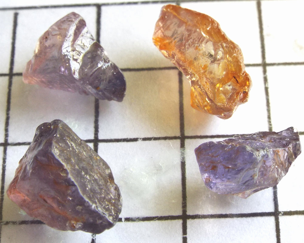 A mixed parcel of Umba Sapphires from Tanzania. The Umba stones are unique in the range of colours shown, usually in the blue to purple range sometimes pink and green. They not only show a strong dichroism - that is, they show two distinct colours - many, but not all, of the Umba Sapphires also show a strong to medium 'colour-change' depending whether they are observed in daylight or incandescent light. It is this phenomena which makes they extremely difficult to photograph as usually the camera picks up the color-change shown in incandescent light.