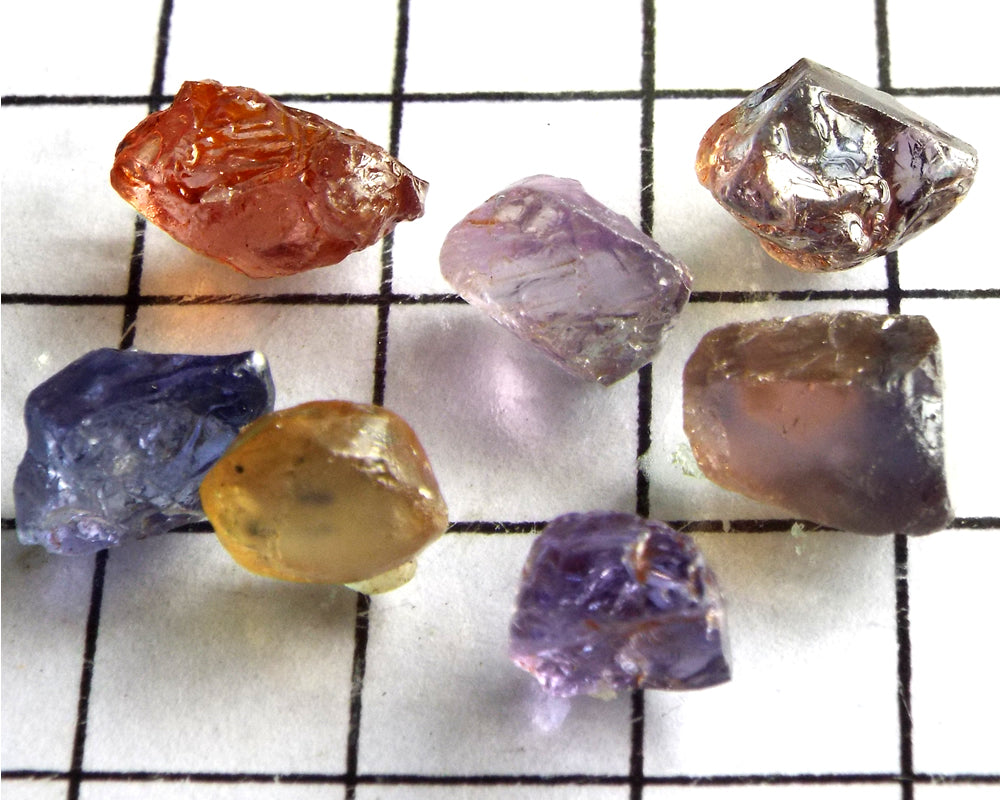 A mixed parcel of Umba Sapphires from Tanzania. The Umba stones are unique in the range of colours shown, usually in the blue to purple range sometimes pink and green. They not only show a strong dichroism - that is, they show two distinct colours - many, but not all, of the Umba Sapphires also show a strong to medium 'colour-change' depending whether they are observed in daylight or incandescent light. It is this phenomena which makes they extremely difficult to photograph as usually the camera picks up the color-change shown in incandescent light.