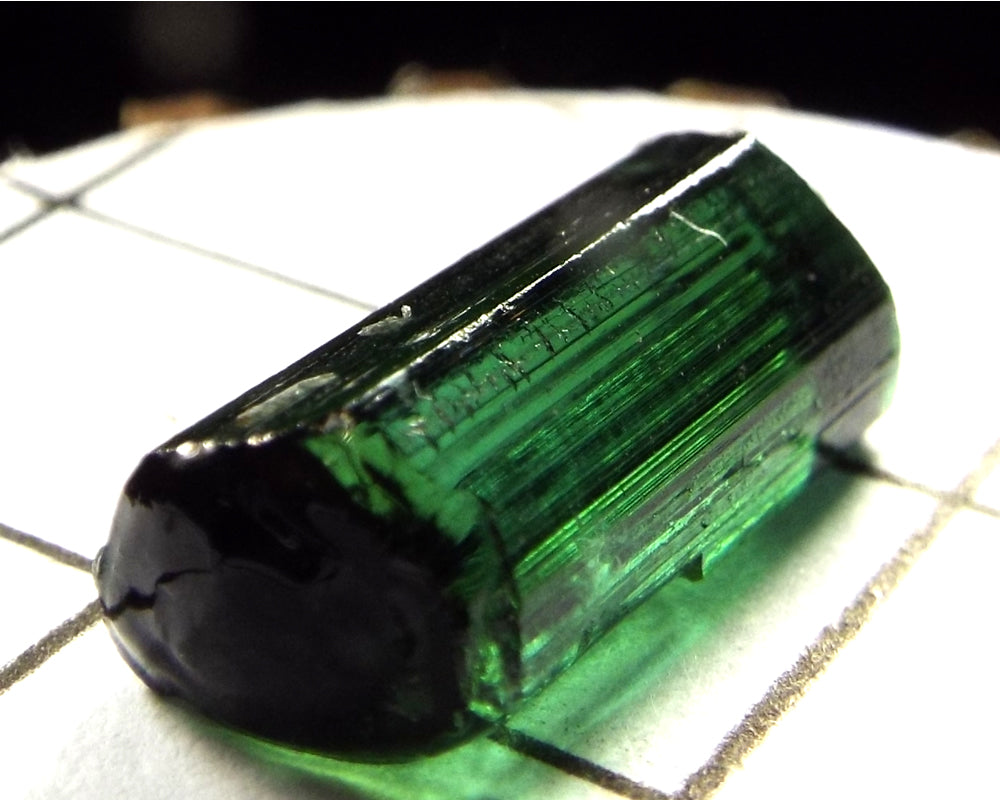 A bright medium green stone with blue tone from Mozambique, showing a semi-open green-yellow 'C' axis.