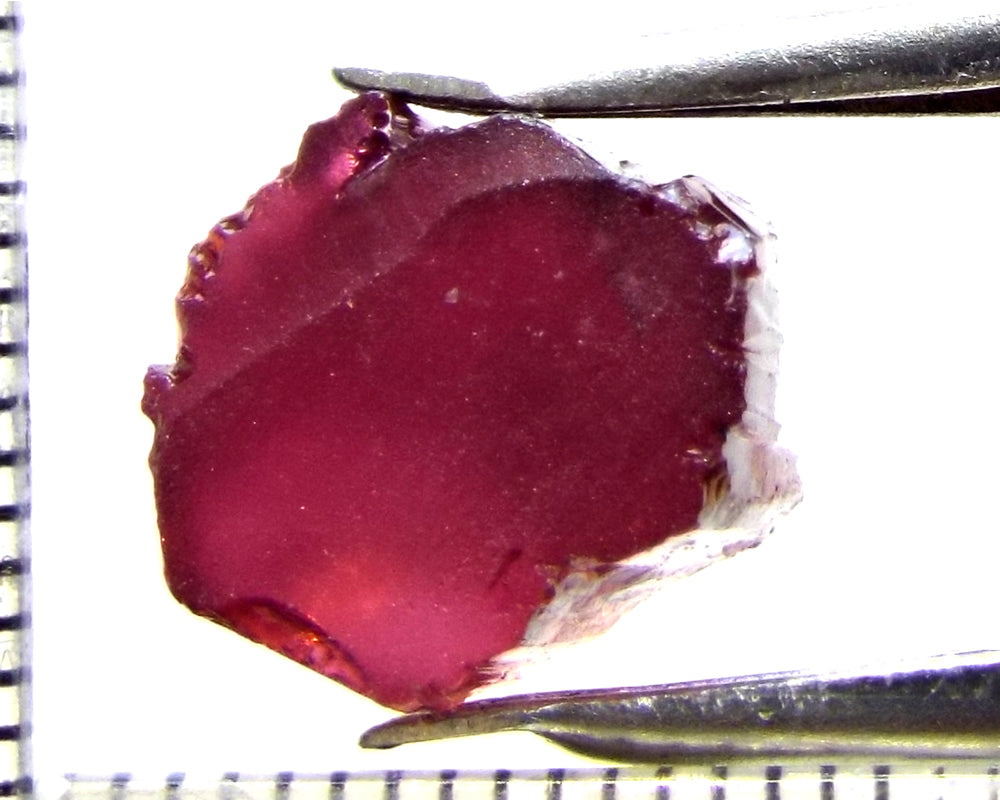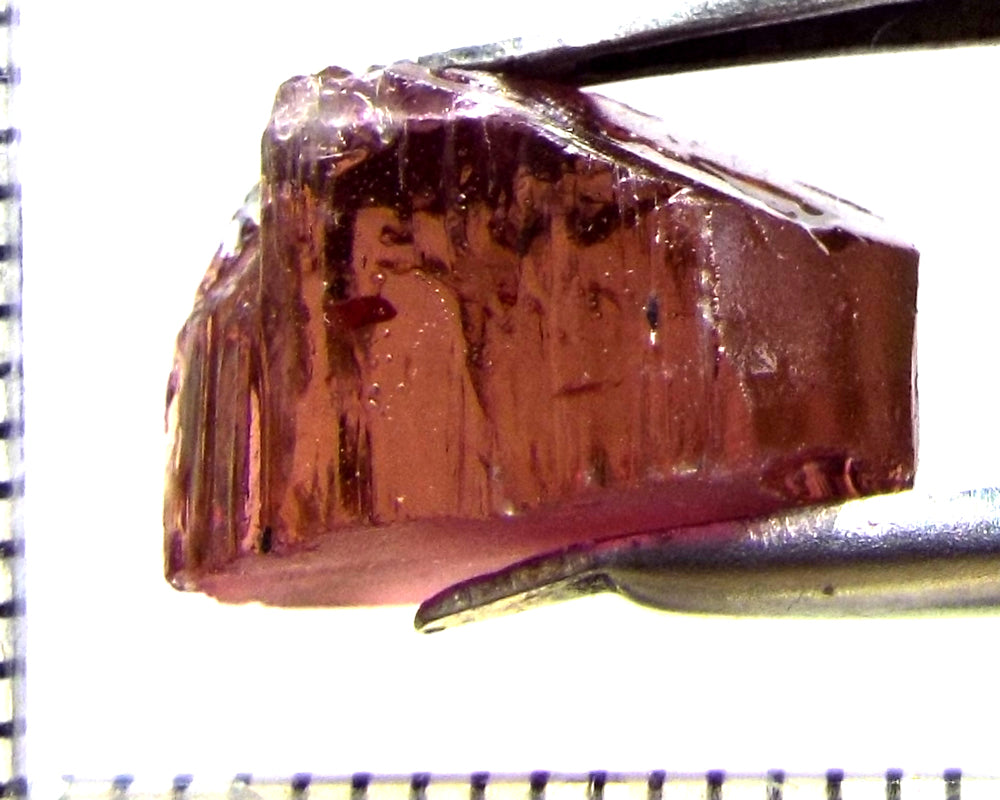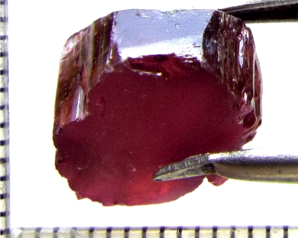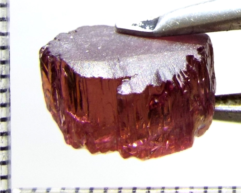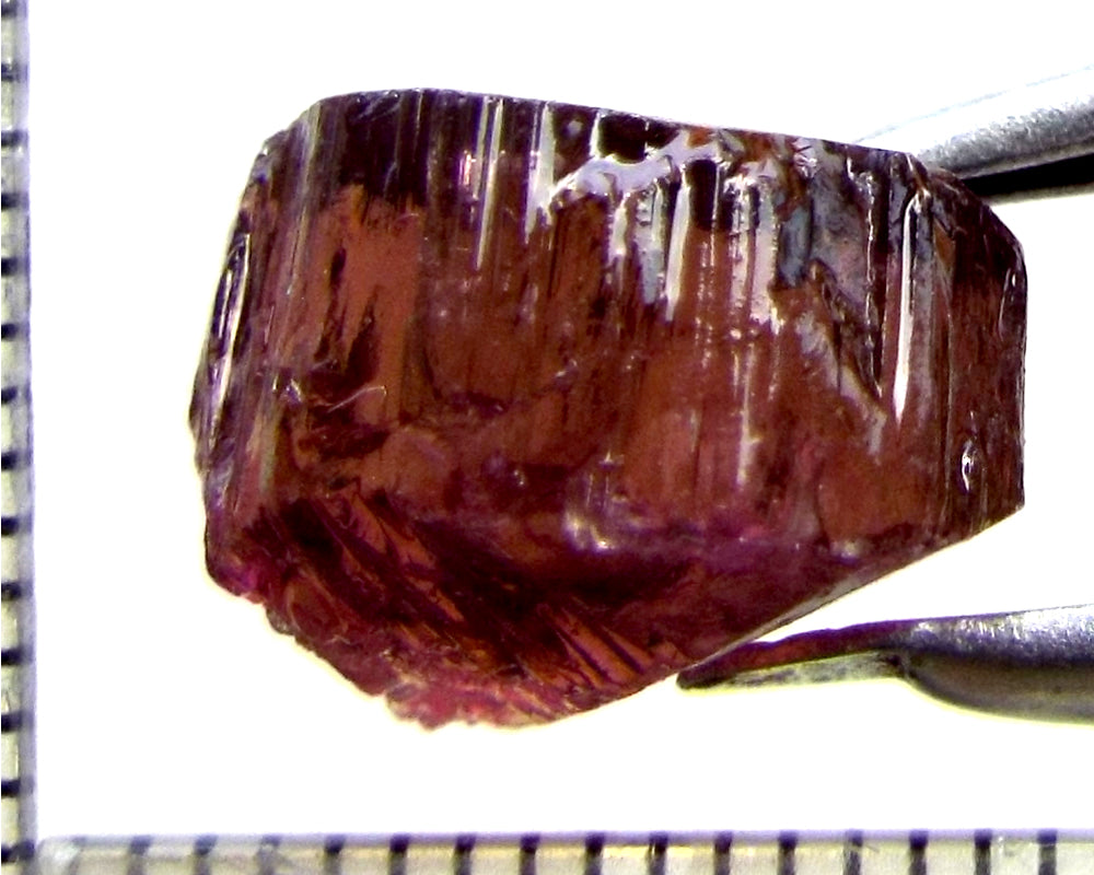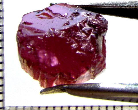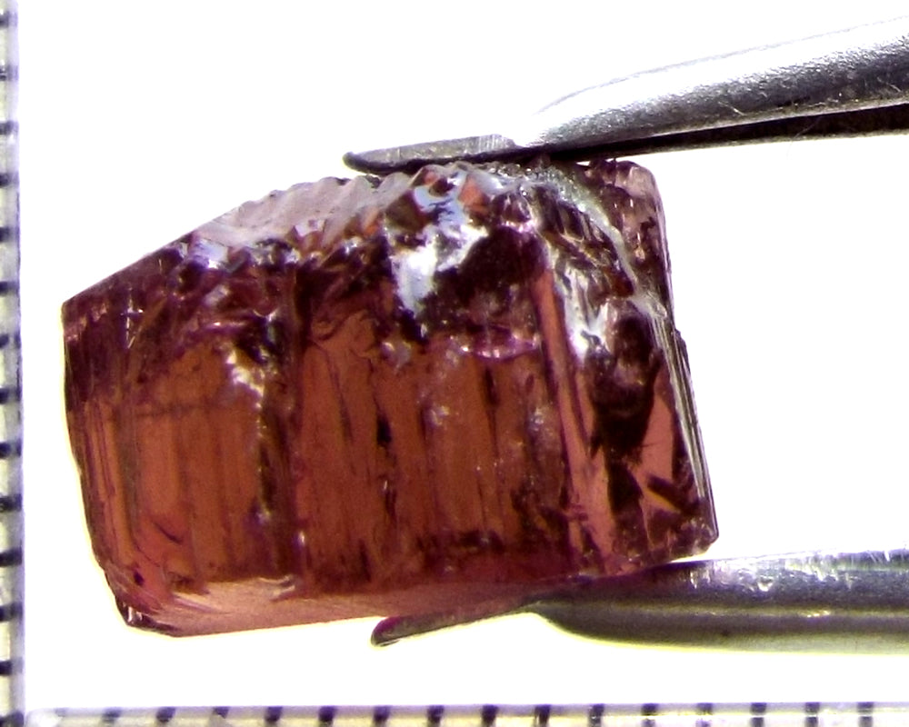 A  bright rich, medium-strong pink-purple stone from Mozambique, showing a lighter tone on the "A" axes and a stronger colour down the "C" axis. The stone, weighing 10.06 cts, has been ground or cobbed clean and is graded AAA.
