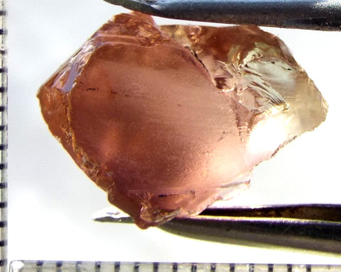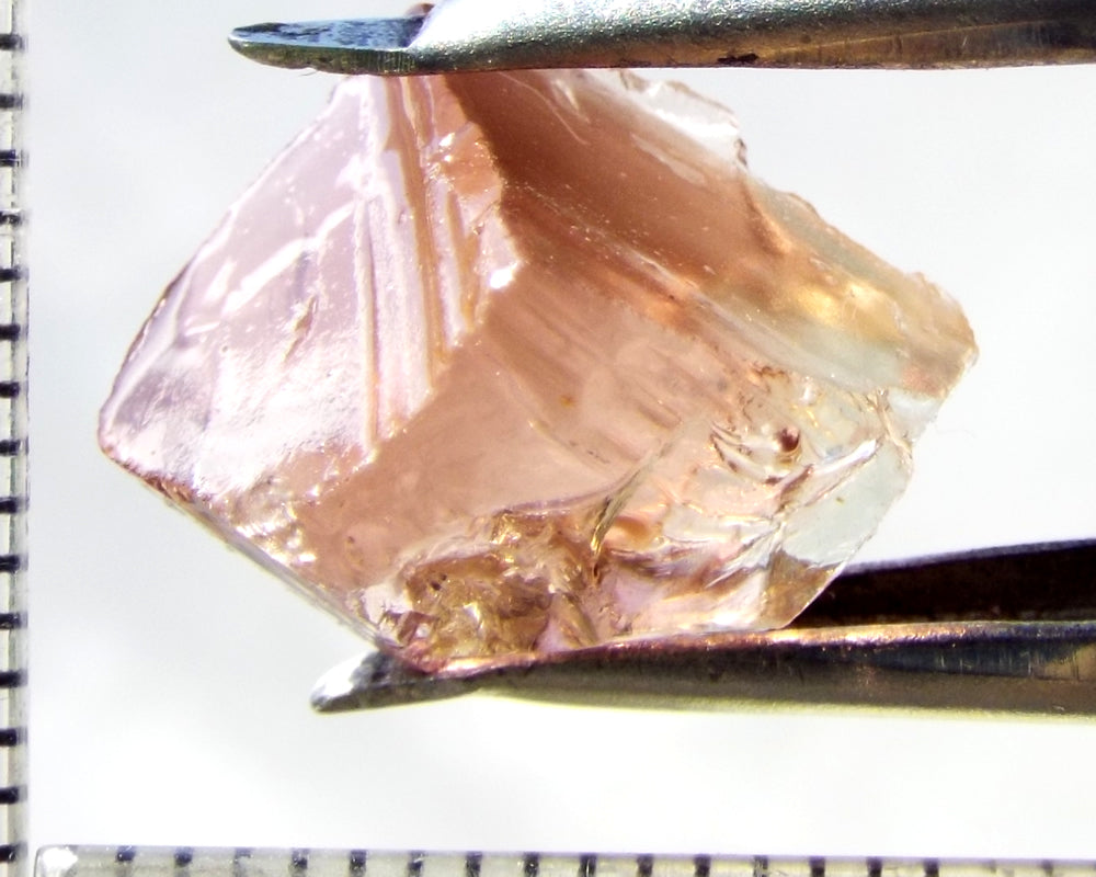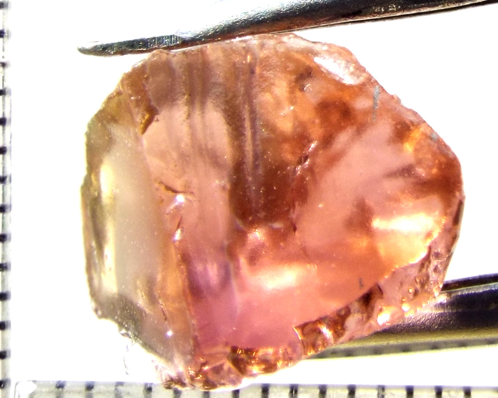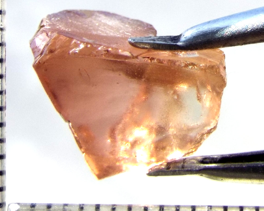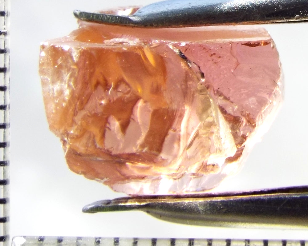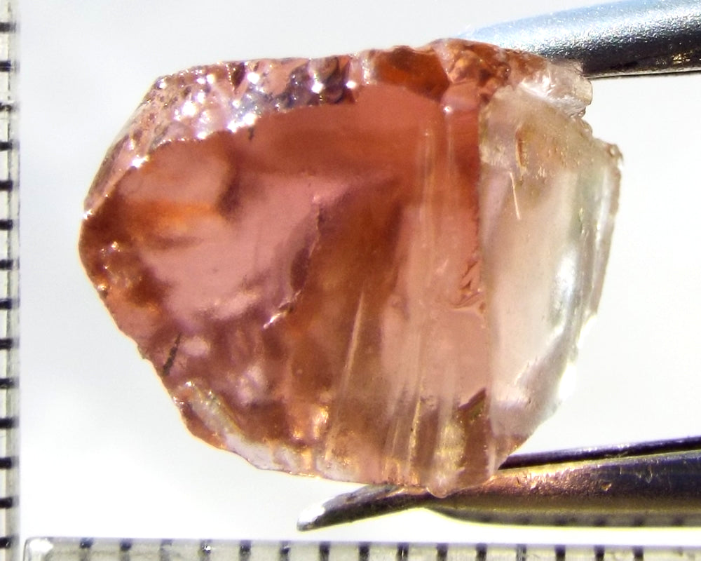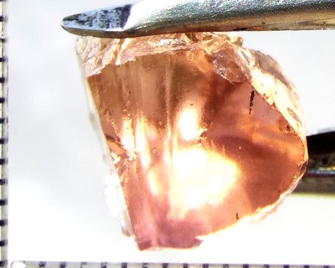 Tourmaline – Mozambique – 10.06 cts - Ref. TOB-585 A bright medium orange-pink stone fromMozambique, showing a deeper colour through the 'C' axes. Graded AAAand weighing 10.06cts. Priced at just $12.00 per carat, a total of $121.00 The scale shown is in millimetres Now beat that for value!