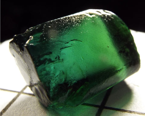 A bright medium green stone with blue tone from Mozambique, showing a semi-open green-yellow 'C' axis.