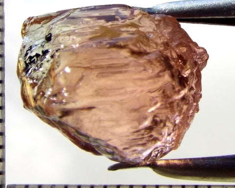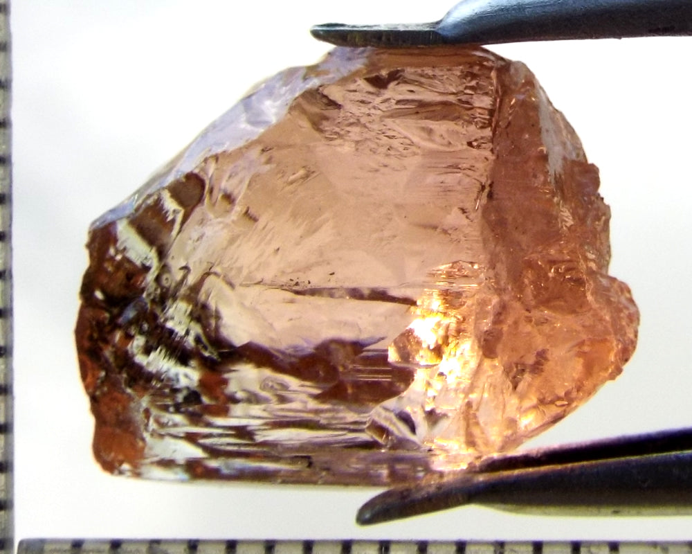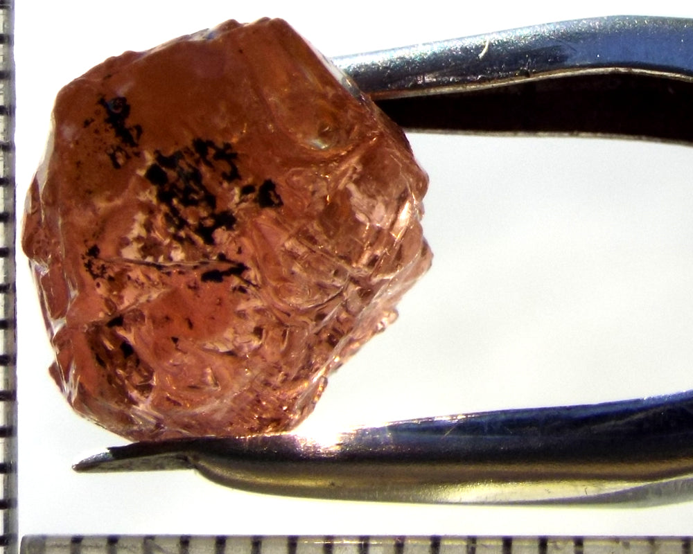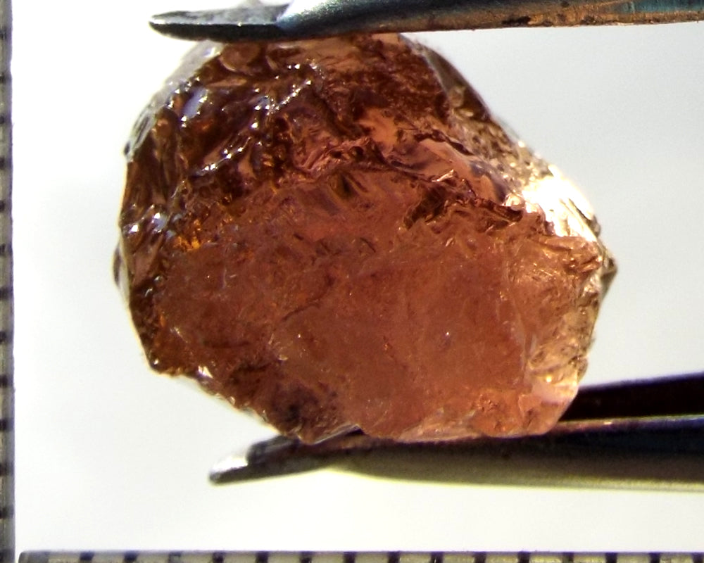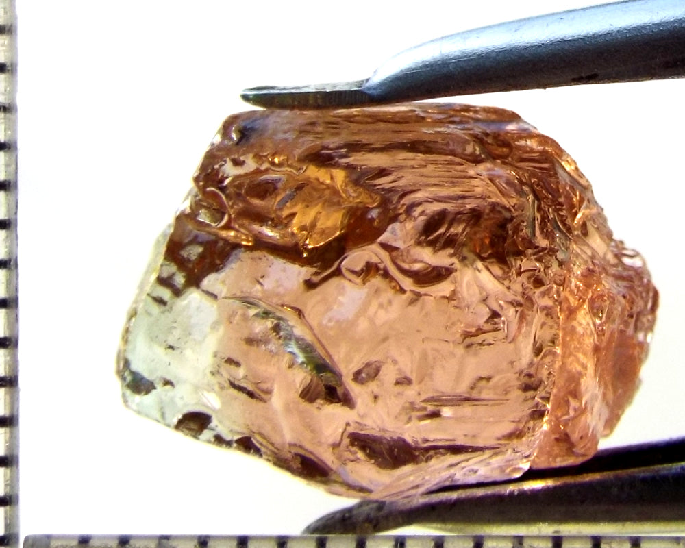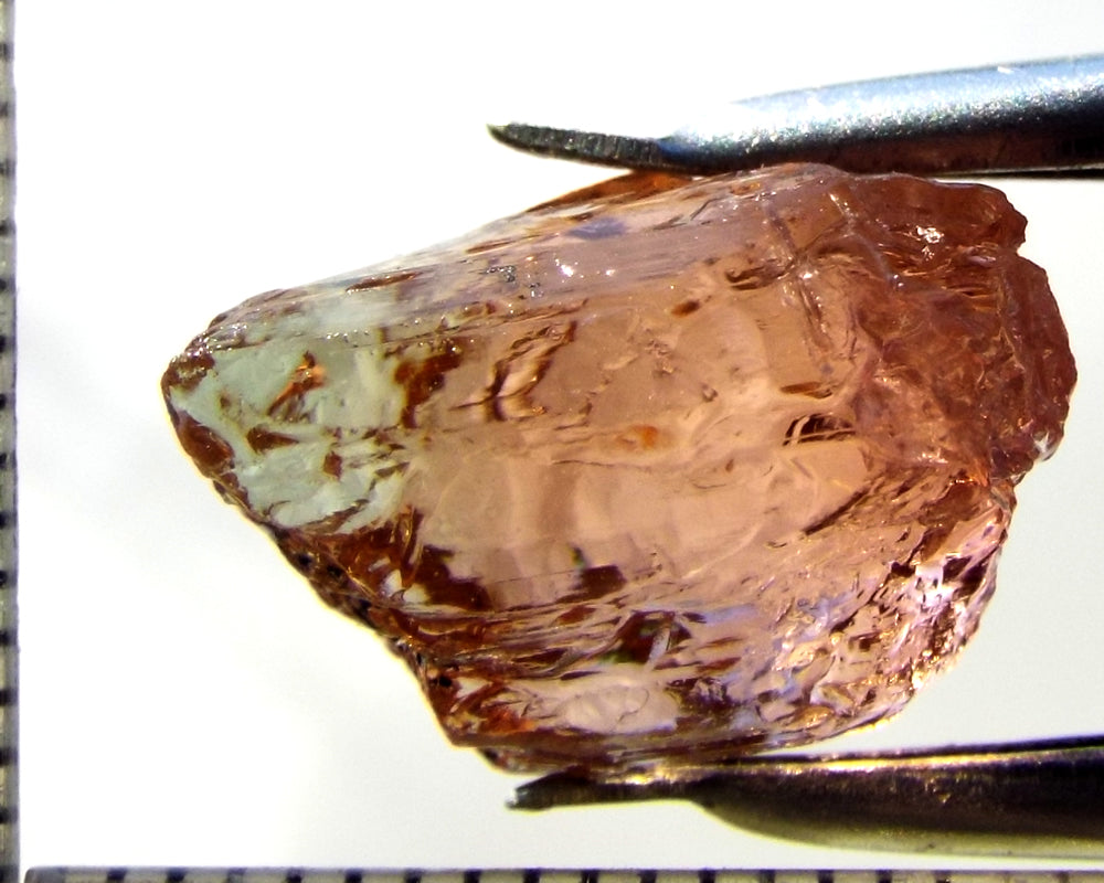 Tourmaline – Mozambique – 13.44 cts - Ref. TOB-587 A bright medium orange-pink stone fromMozambique, showing a deeper colour through the 'C' axes. Graded AAAand weighing 13.44cts. Priced at just $18.00 per carat, a total of $242.00 The scale shown is in millimetres Now beat that for value!