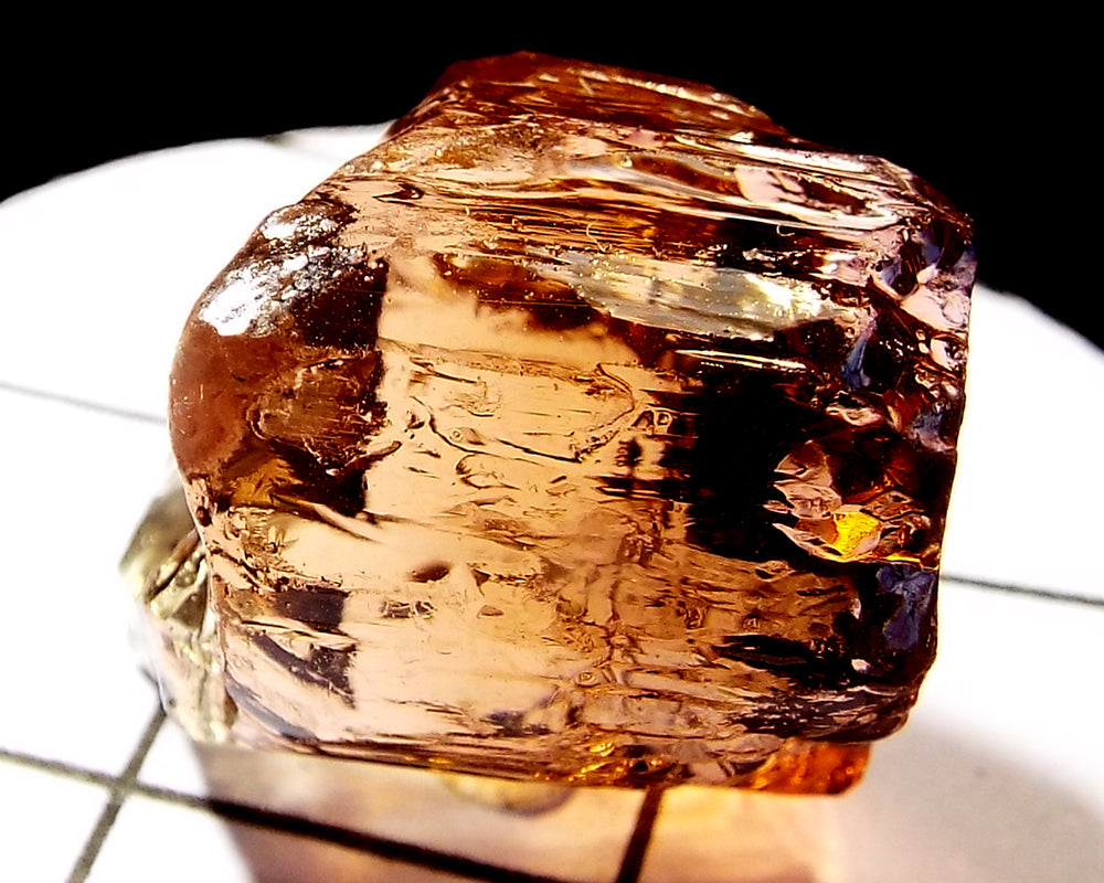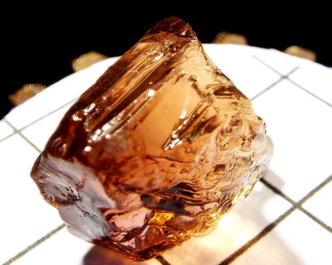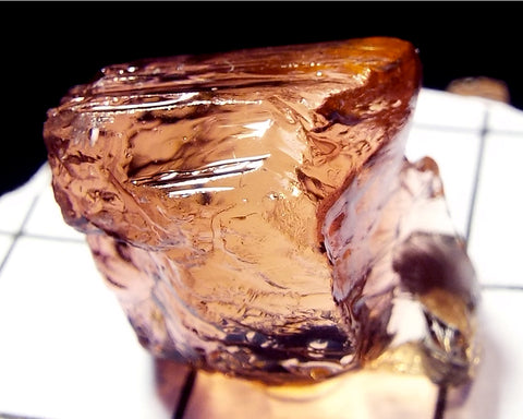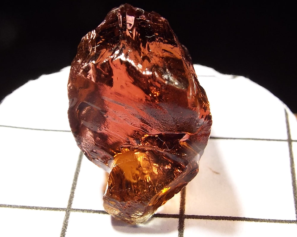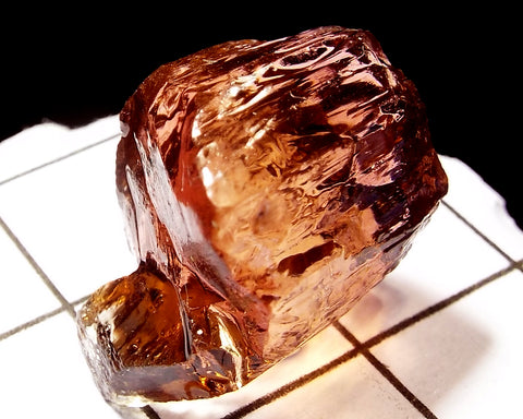 A bright medium-light pink-orange stone from Mozambique, showing a darker pink 'C' axis.