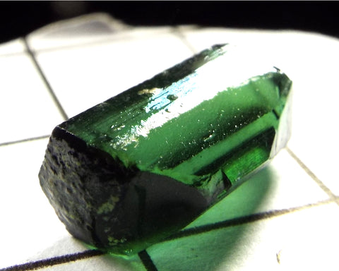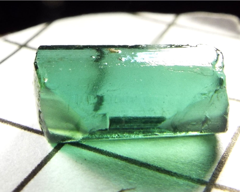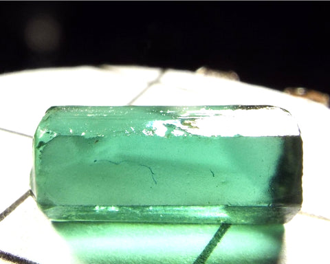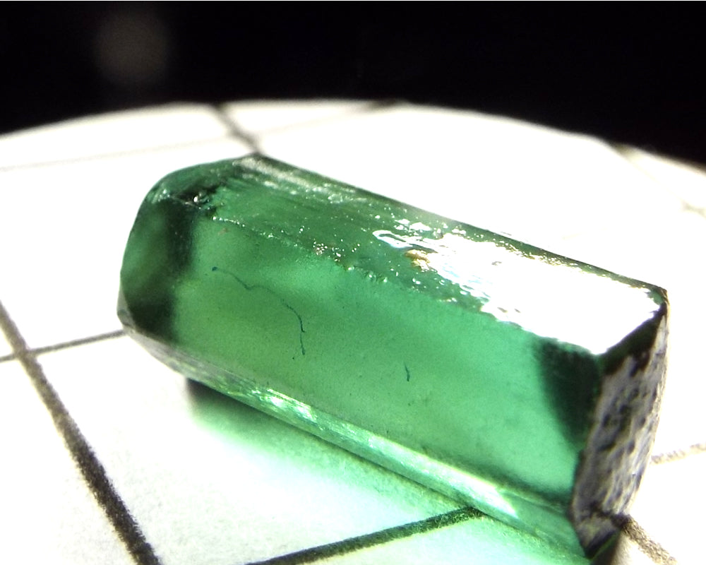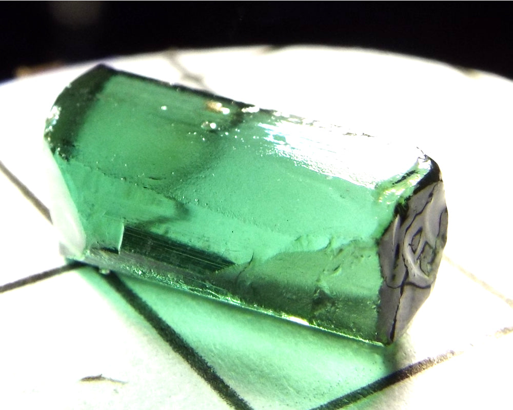 A  bright medium green stone with blue tone from Mozambique, showing a semi-open green-yellow 'C' axis.