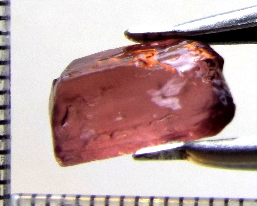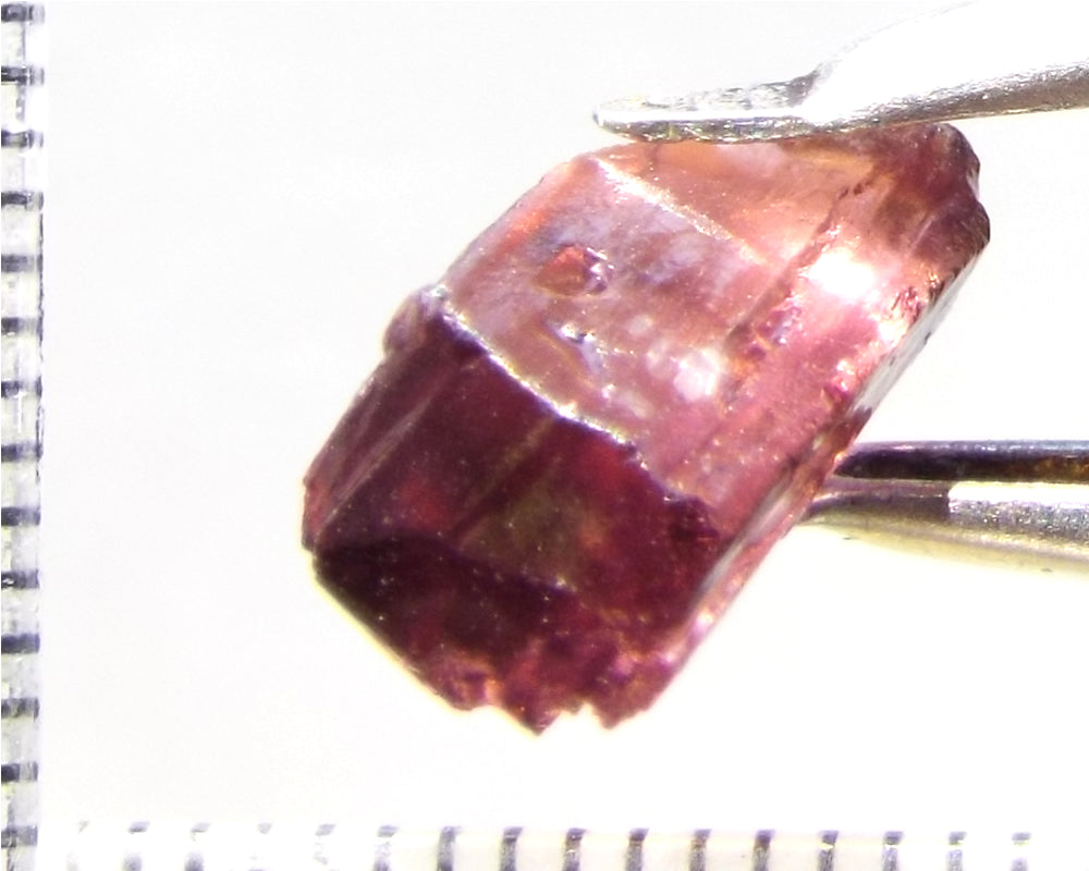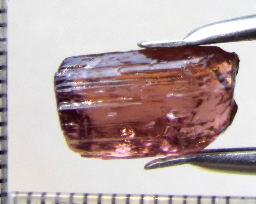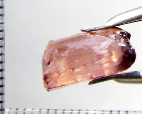 A bright rich, medium-strong pink-purple stone from Mozambique, showing a lighter tone on the "A" axes and a stronger colour down the "C" axis. The stone, weighing 5.12 cts, has been ground or cobbed clean and is graded AAA.