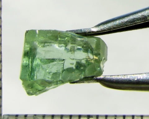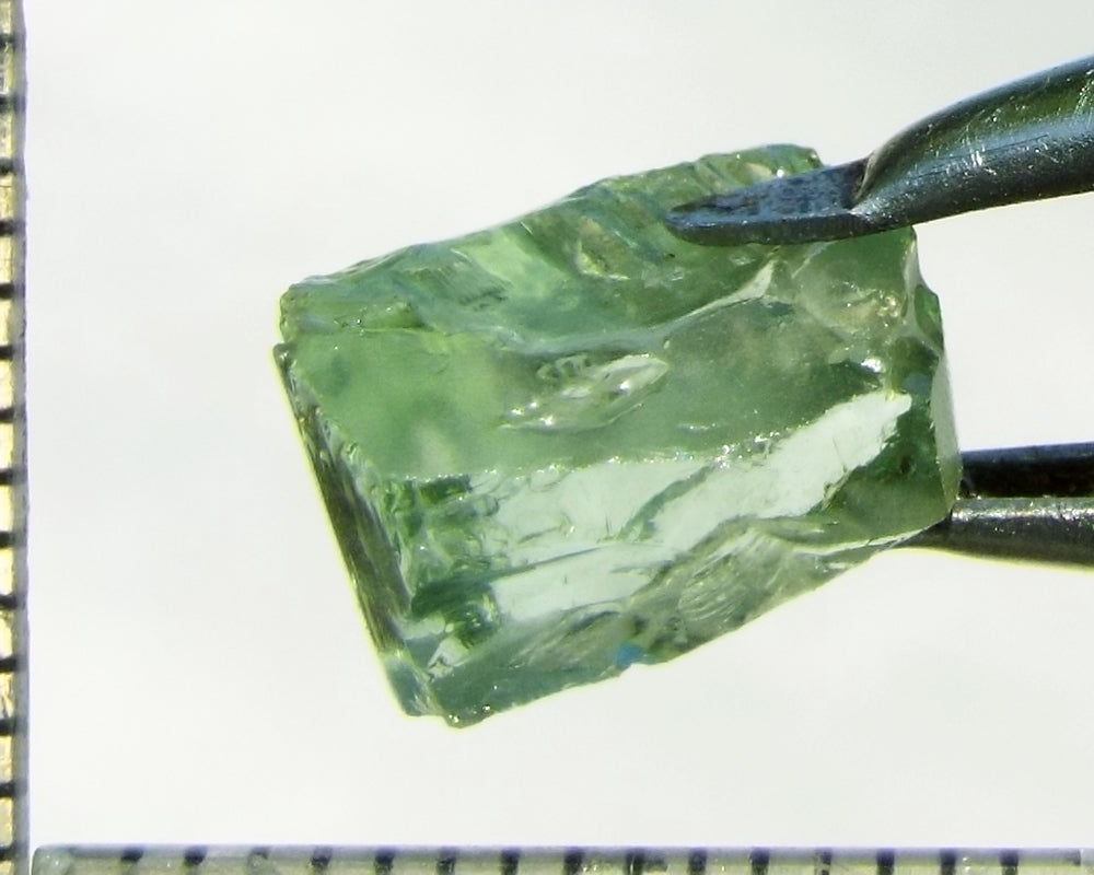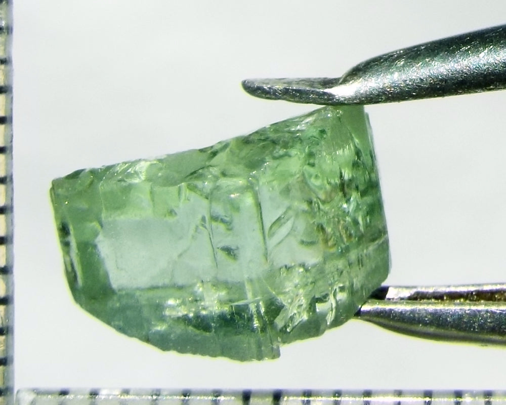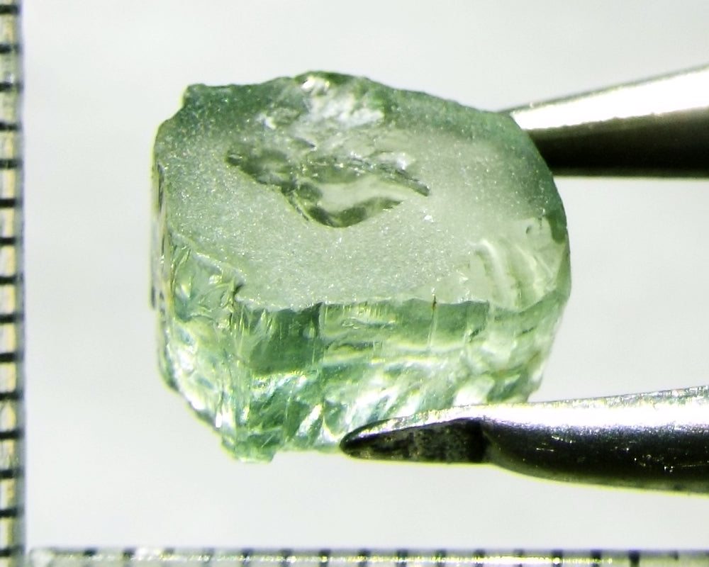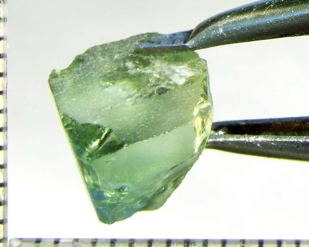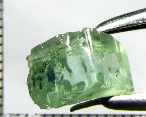 A  bright medium-light mint-green, slightly yellow stone with a touch of blue from Mozambique, showing a yellow-green 'C' axis.