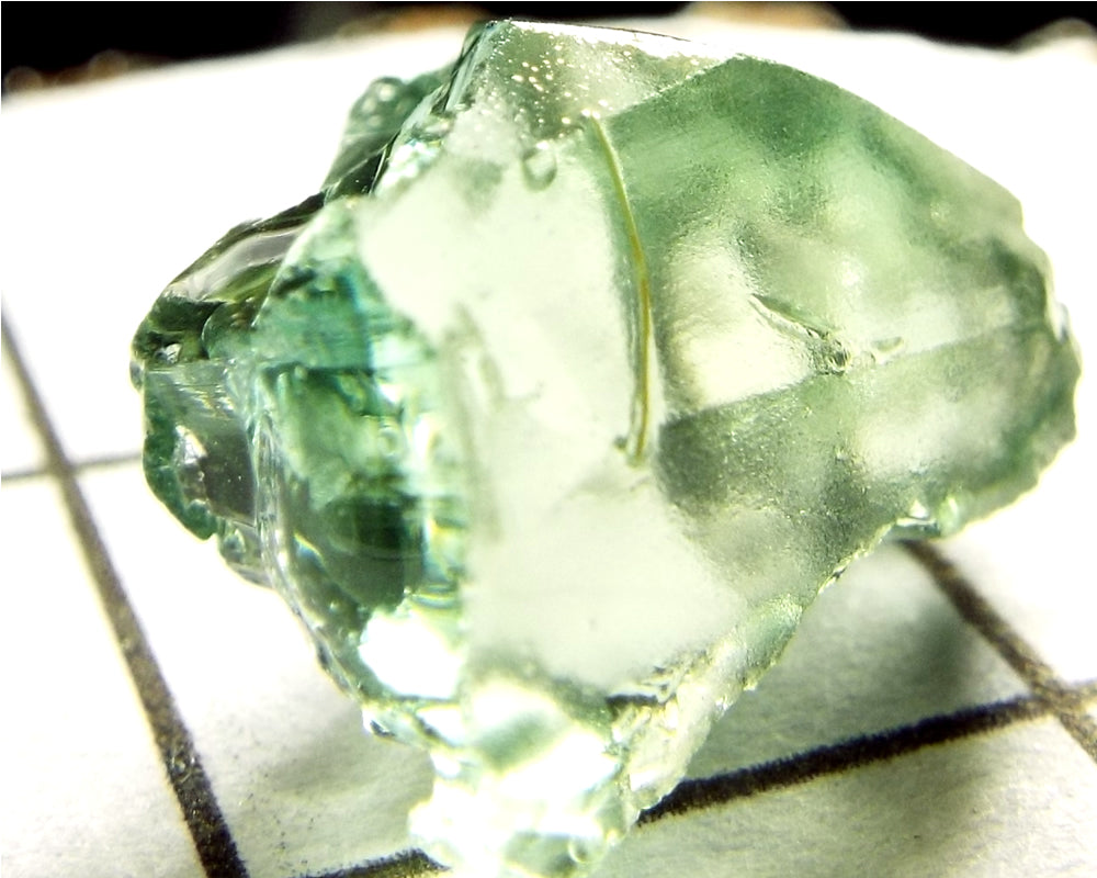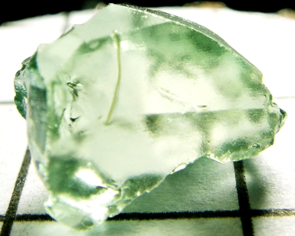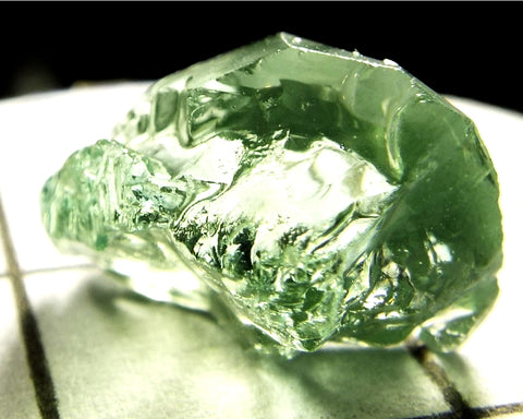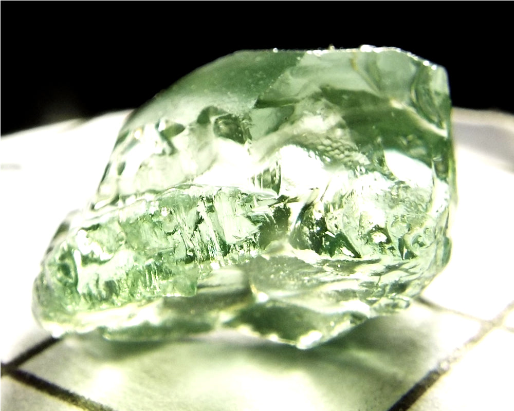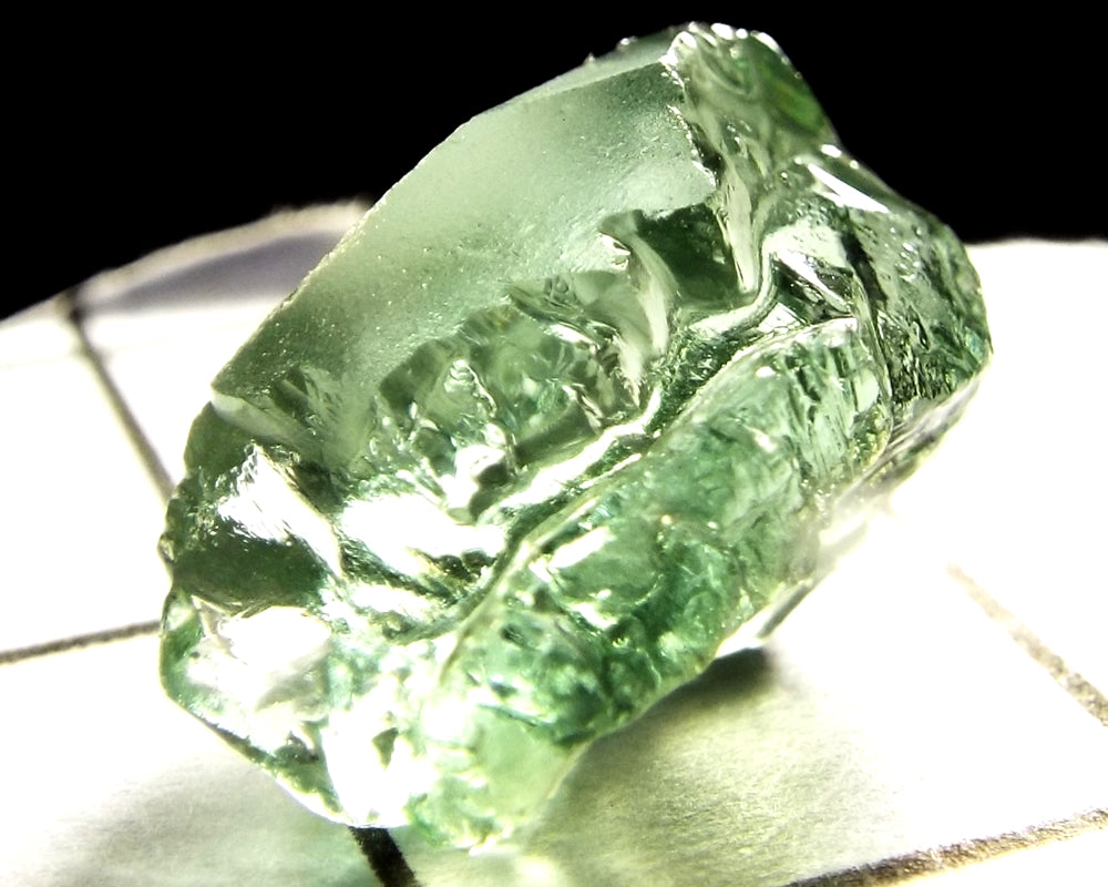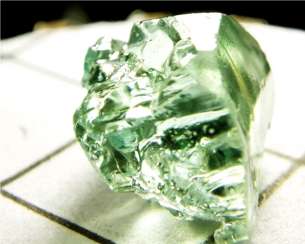 A  bright medium-light mint slightly yellow-green stone from Mozambique, showing a deeper coloured 'C' axis.