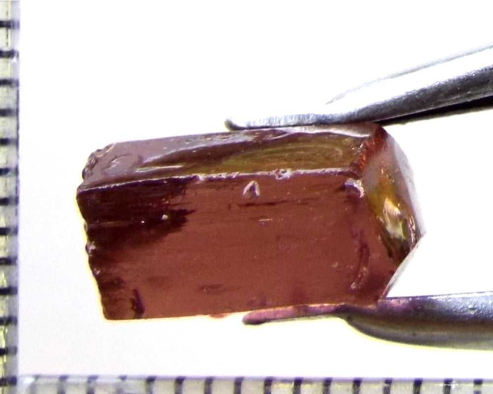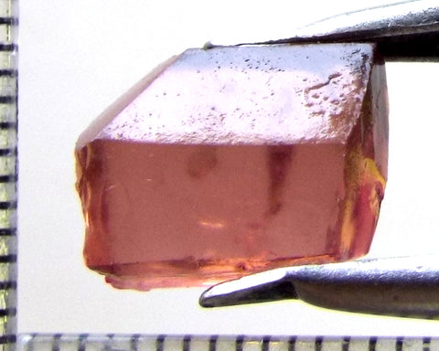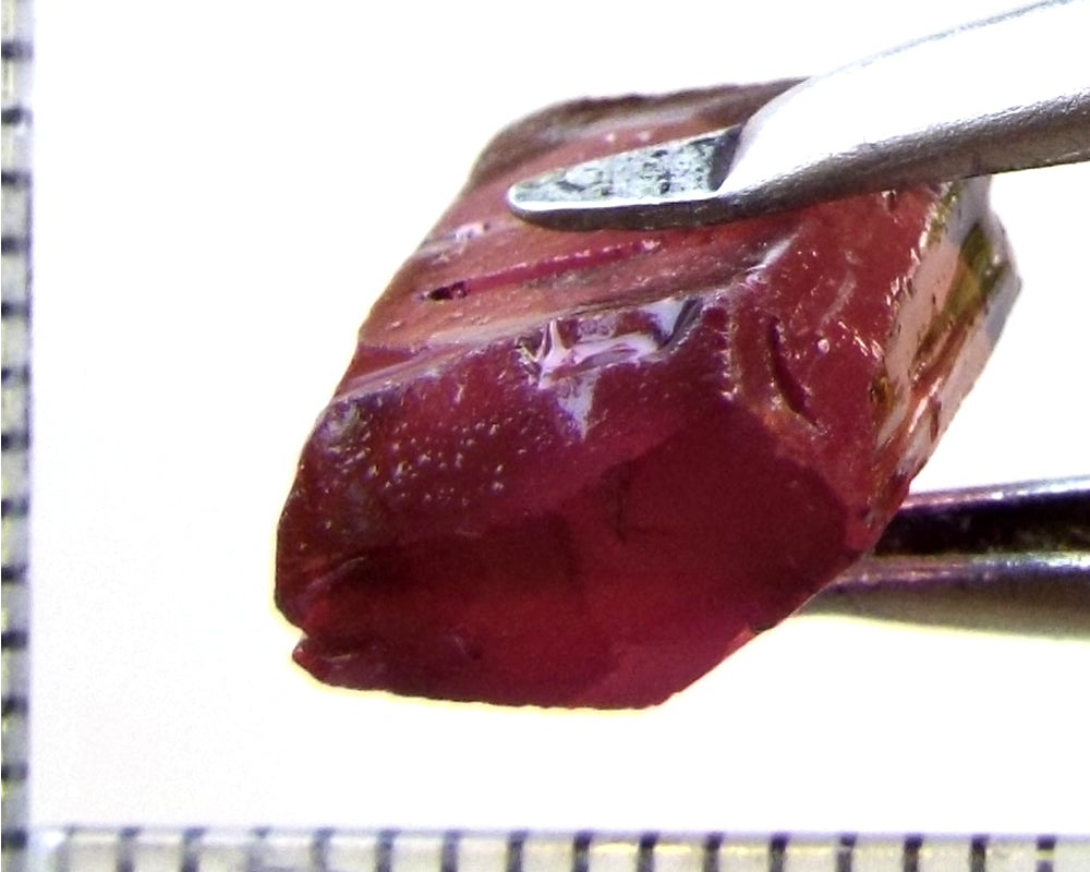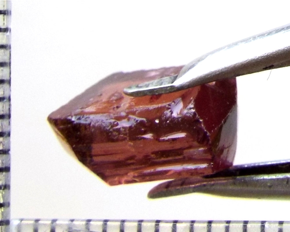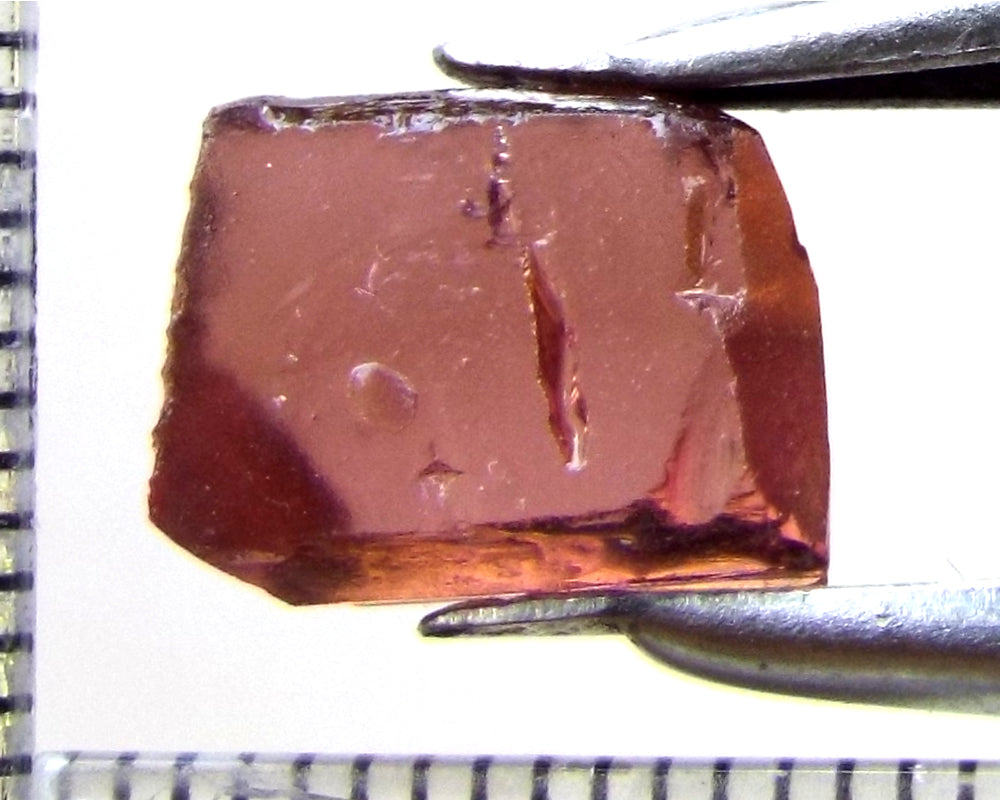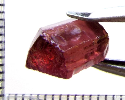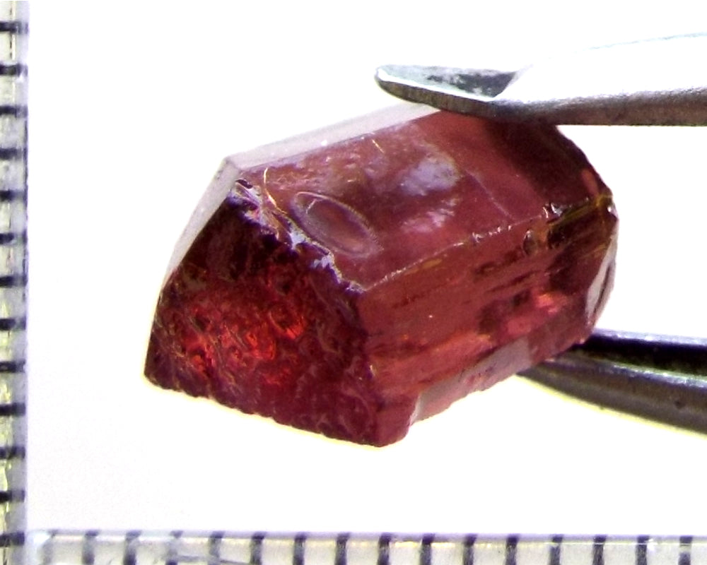 A  bright rich, medium-strong pink-purple stone from Mozambique, showing a lighter tone on the "A" axes and a stronger colour down the "C" axis. The stone, weighing 5.73 cts, has been ground or cobbed clean and is graded AAA.