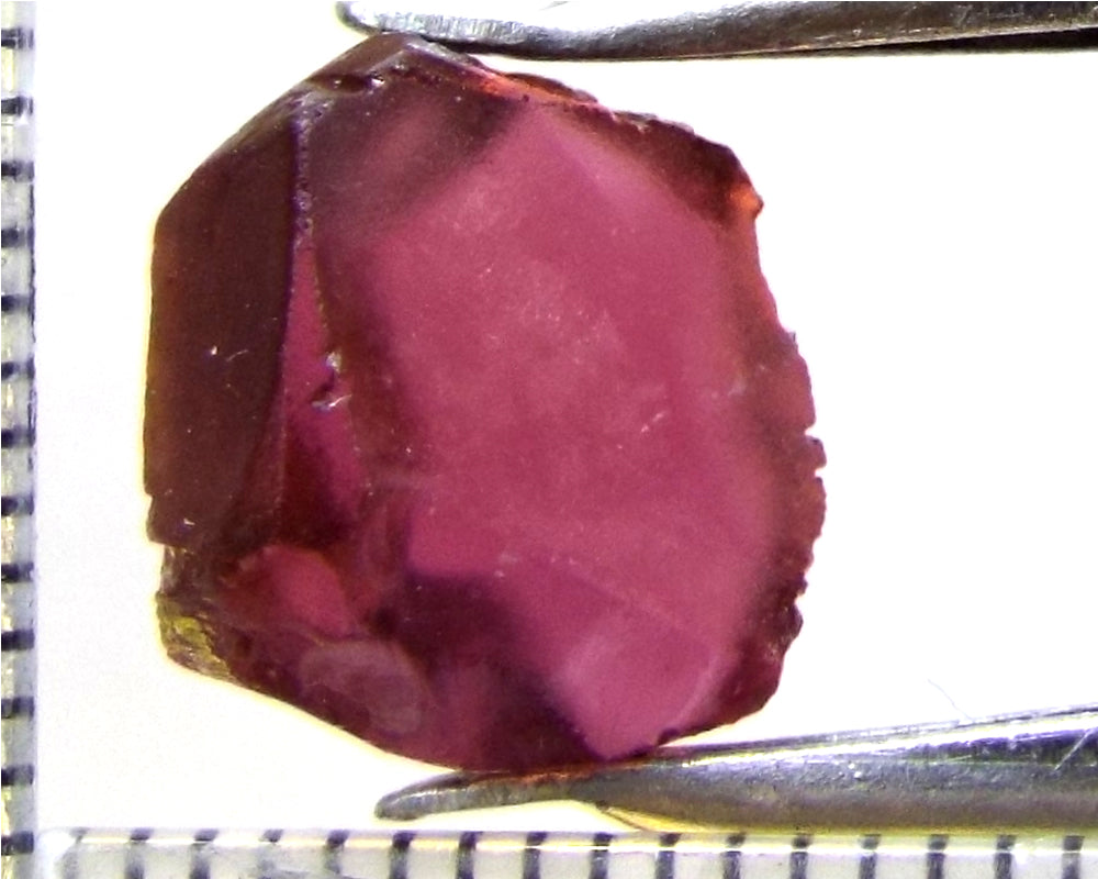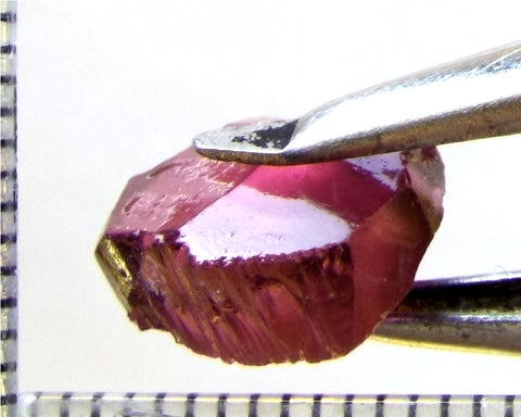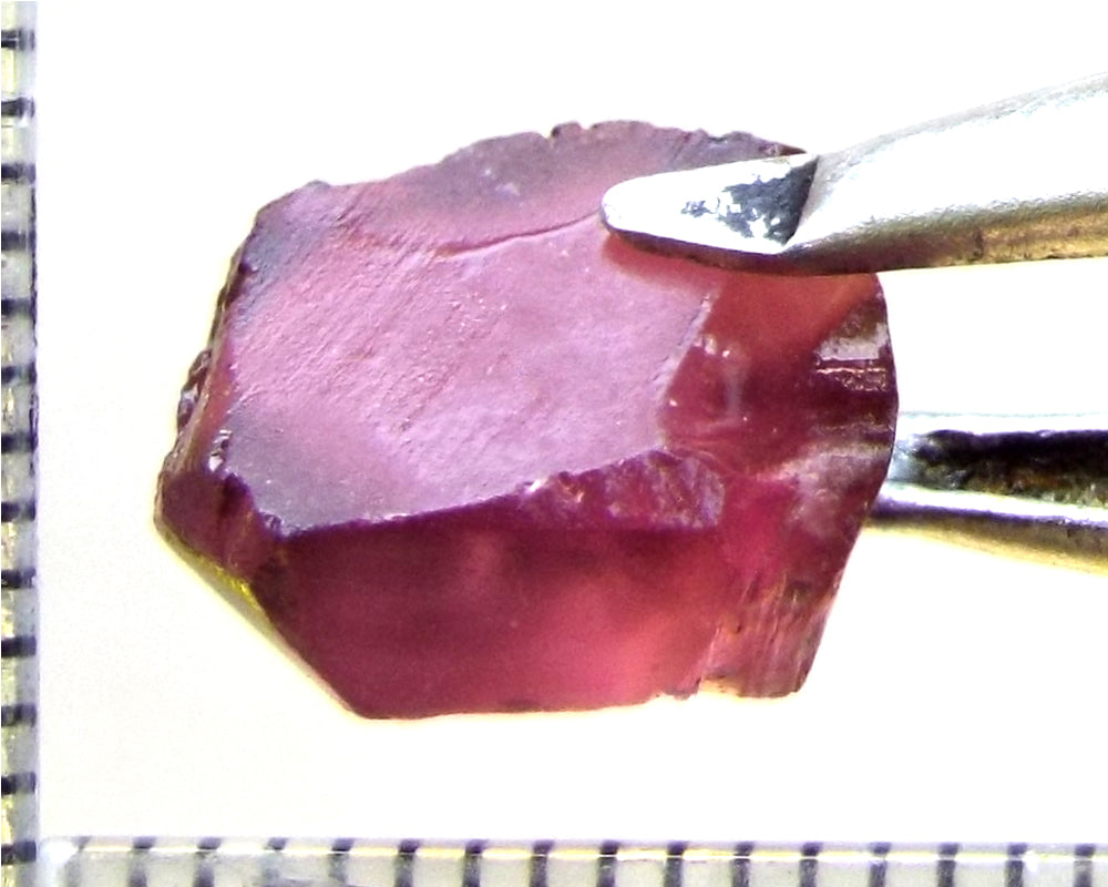 A bright rich, medium-strong pink-purple stone from Mozambique, showing a lighter tone on the "A" axes and a stronger colour down the "C" axis. The stone, weighing 6.25 cts, has been ground or cobbed clean and is graded AAA.