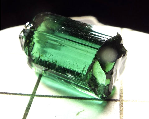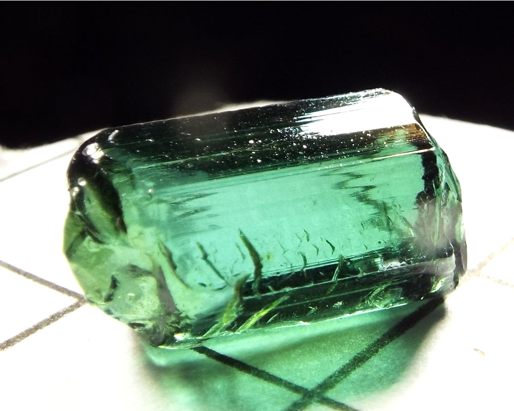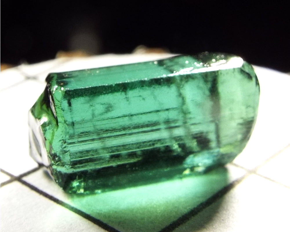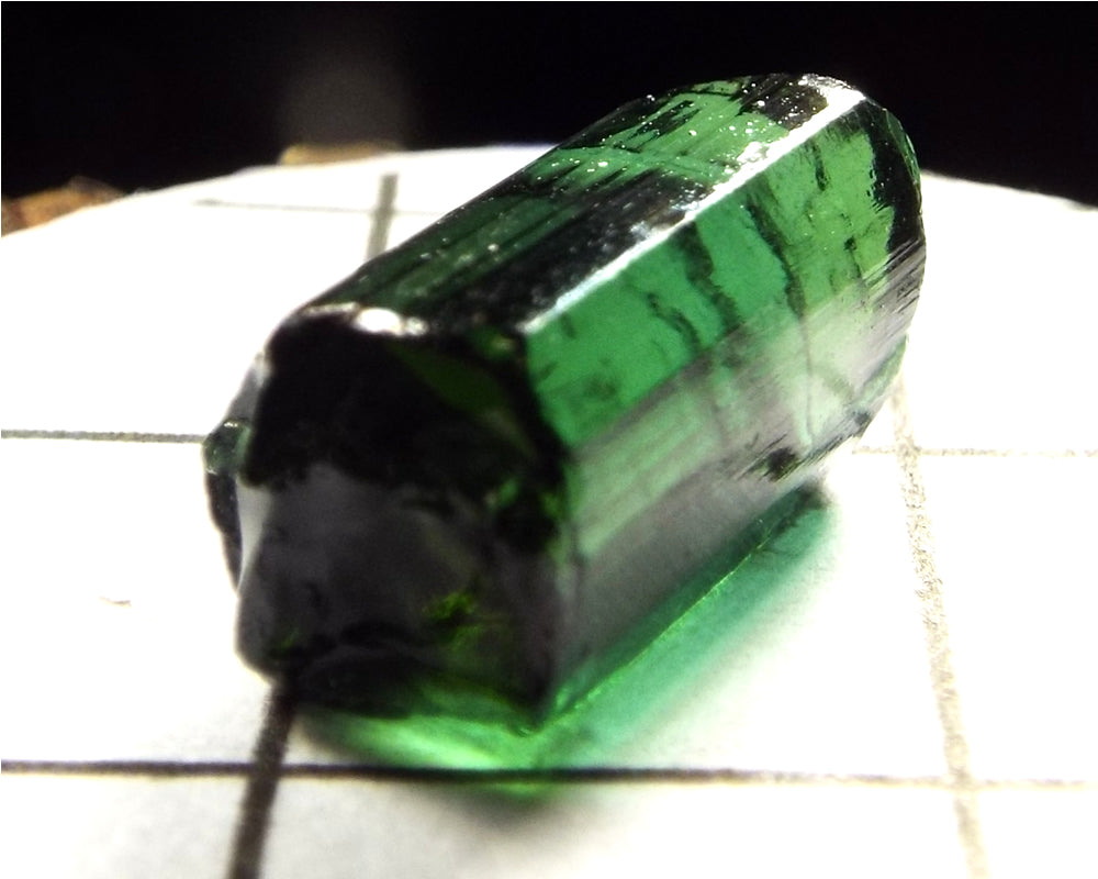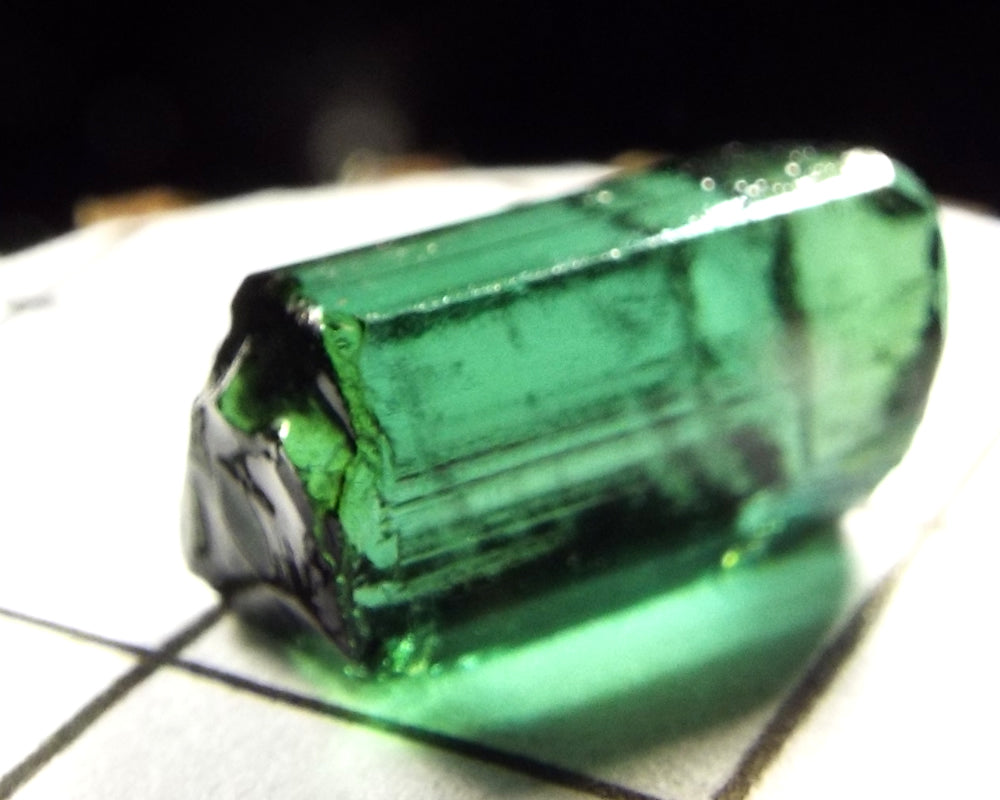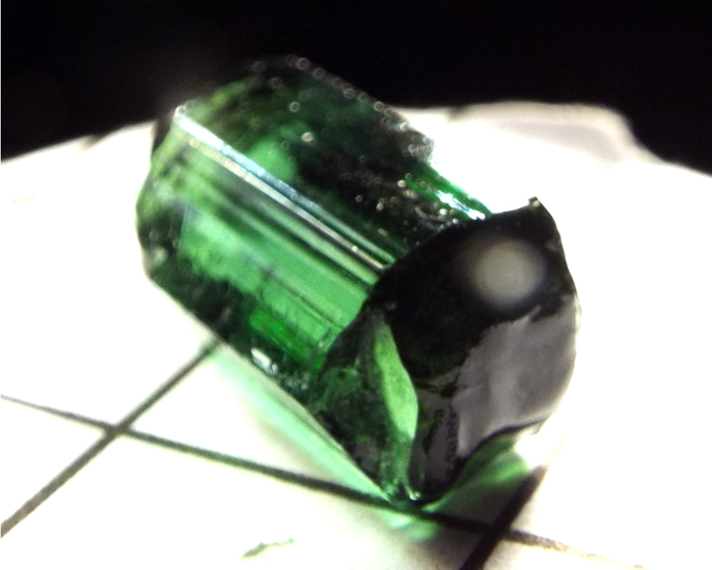 A bright medium green stone with blue tone from Mozambique, showing a semi-open green-yellow 'C' axis.
