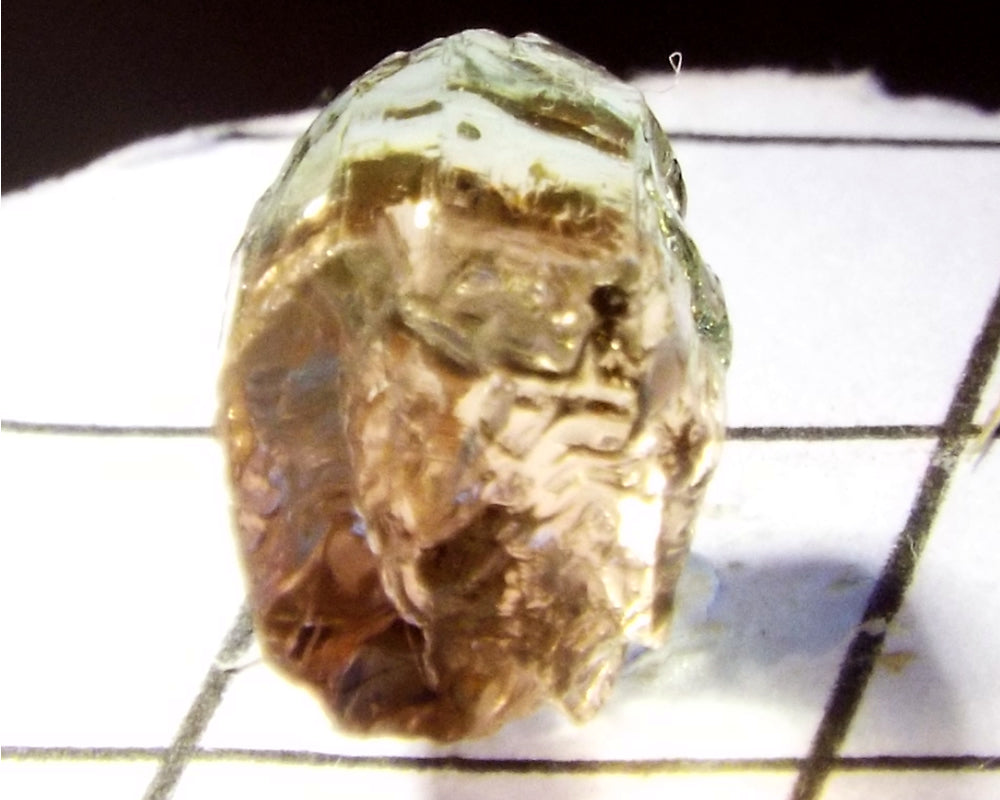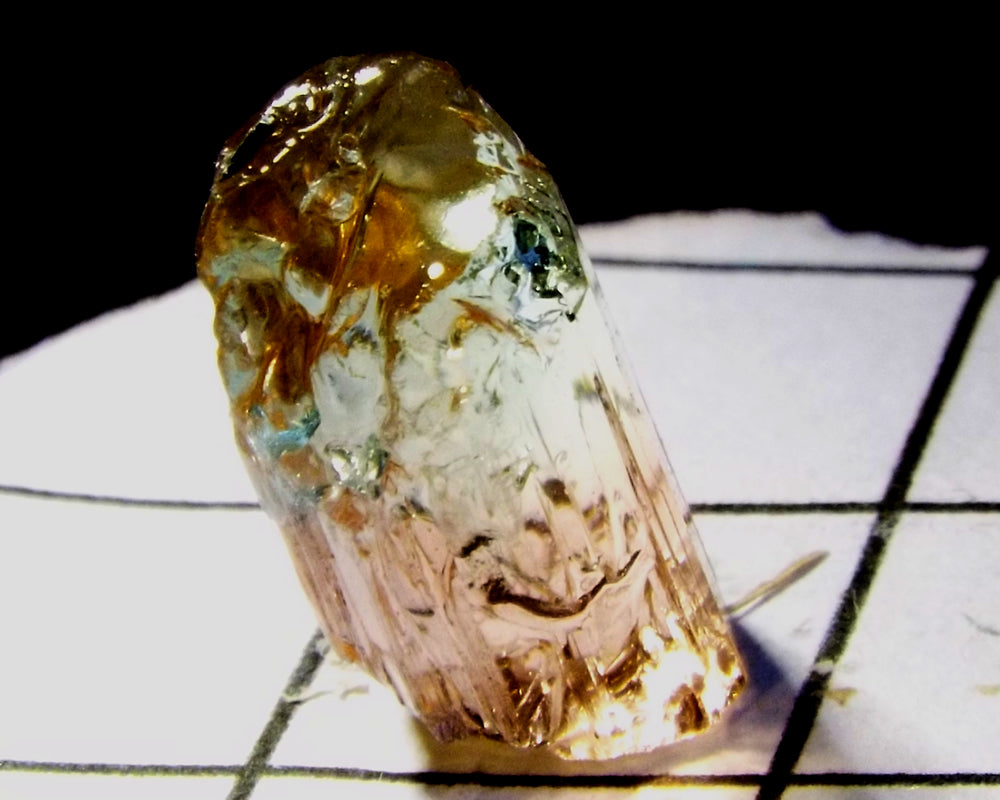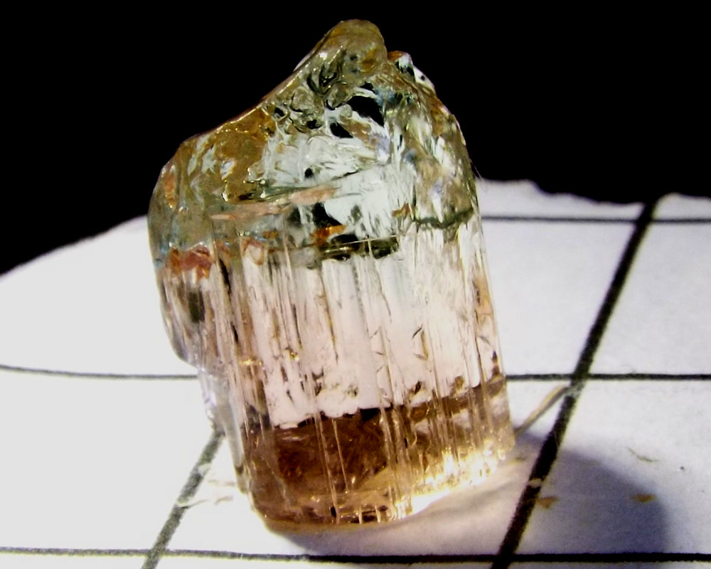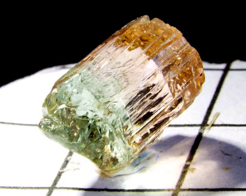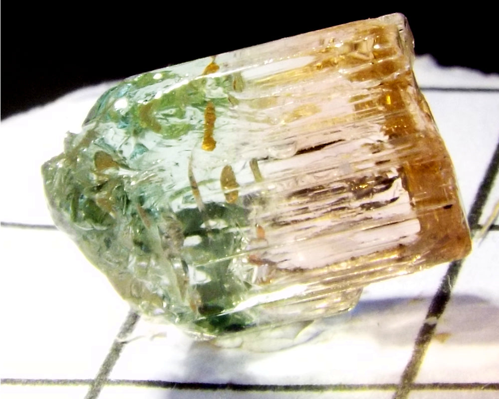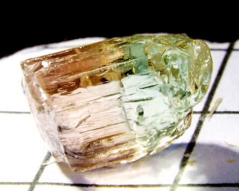 A bright light bi-colour stone from Mozambique, showing a showing a light pink to green colouration with a light orange 'C' axis.