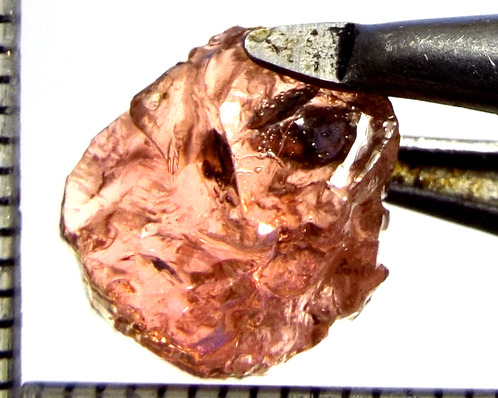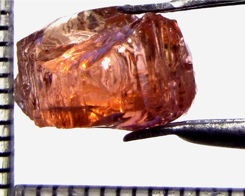 A bright light orange-pink stone from Mozambique, showing a deeper orange-pink 'C' axis.