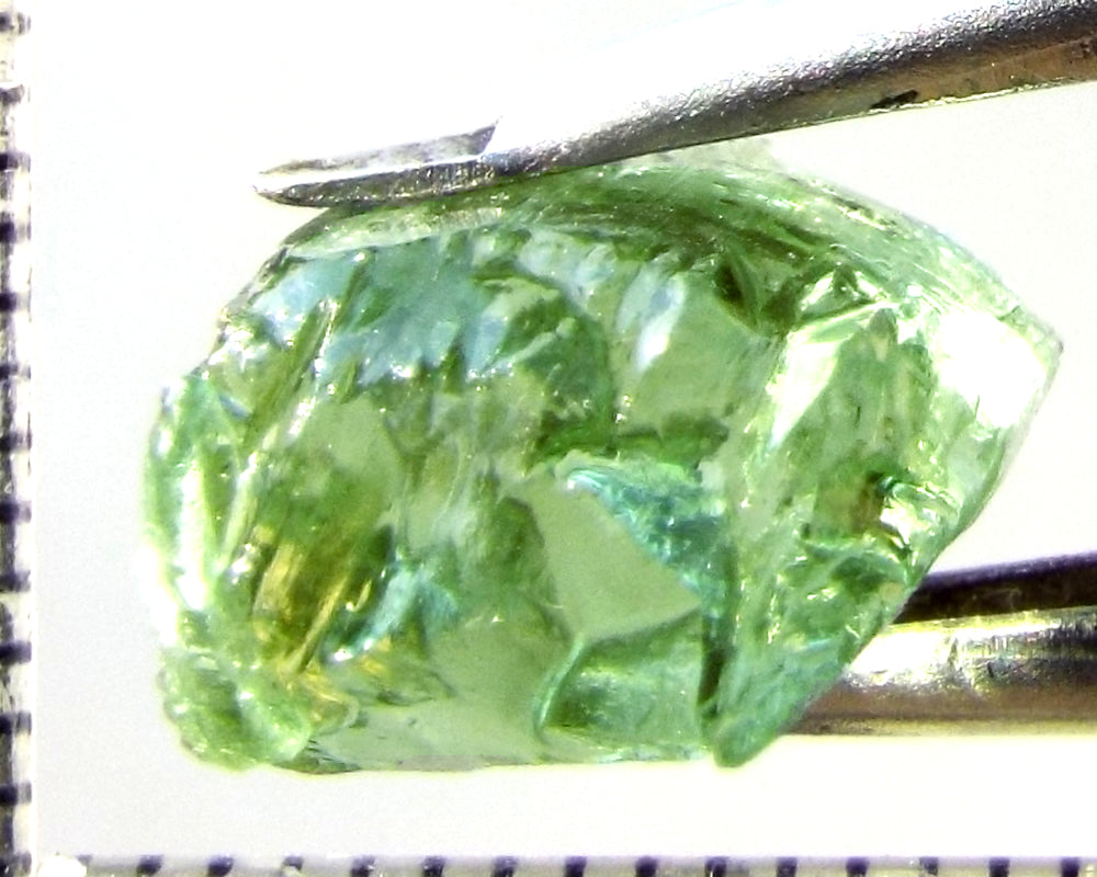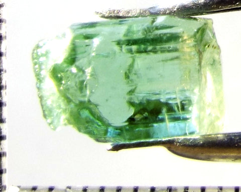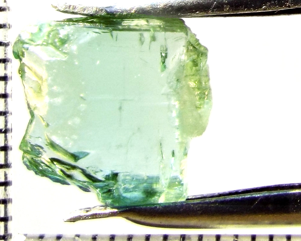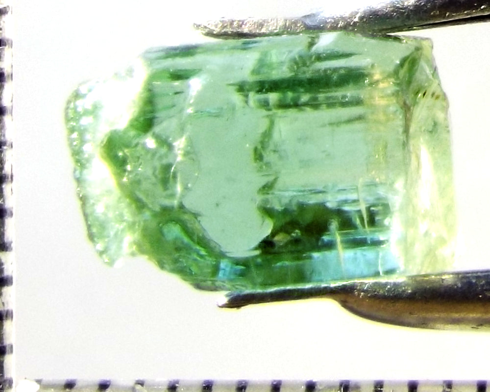 A  bright medium-light mint-green, slightly yellow stone with a touch of blue from Mozambique, showing a yellow-green 'C' axis.