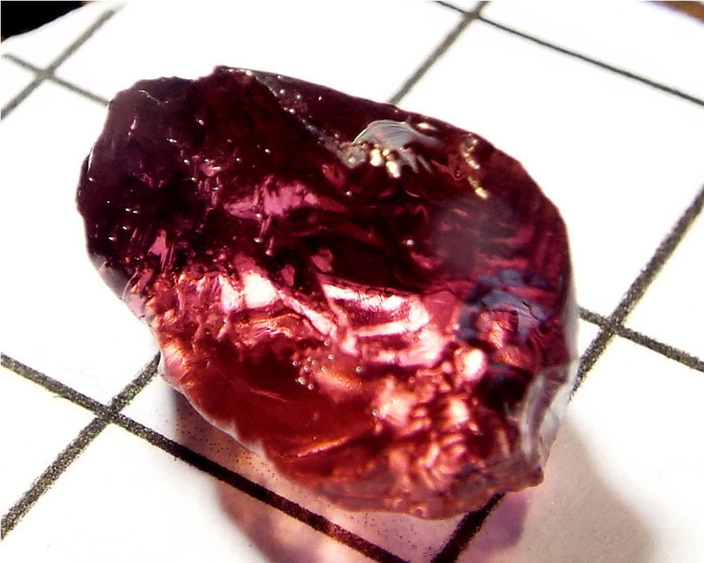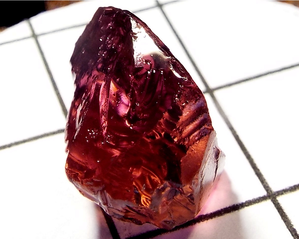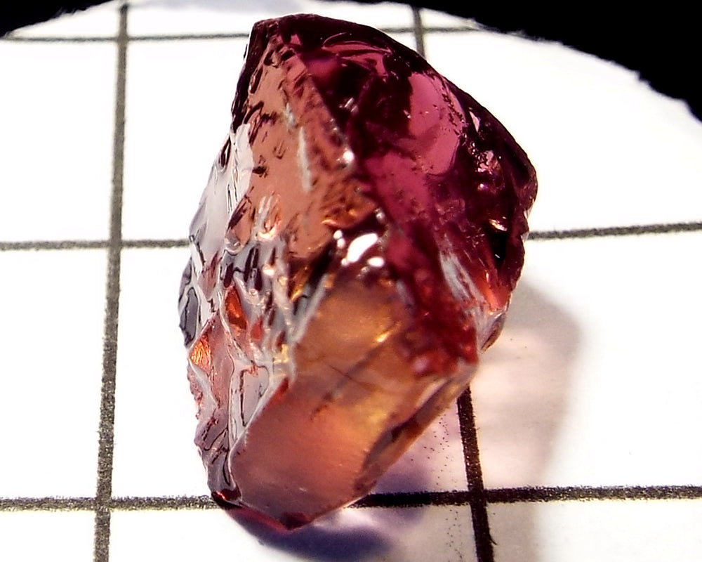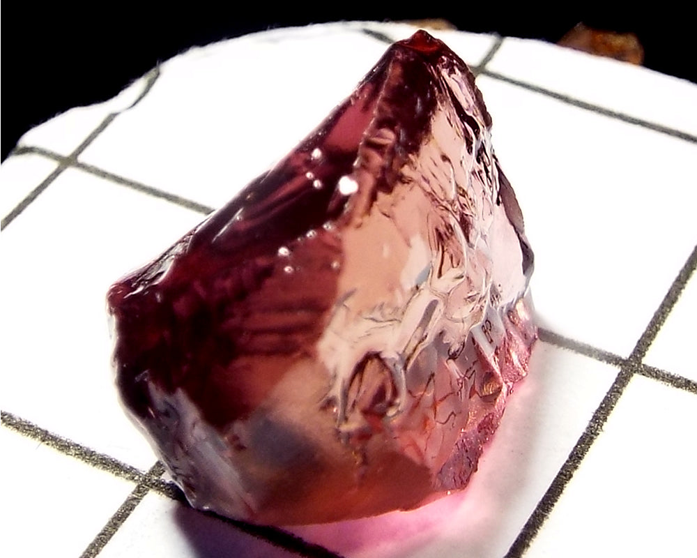 A bright medium-strong pink-purple stone from Mozambique, showing a darker purple-pink 'C' axis.