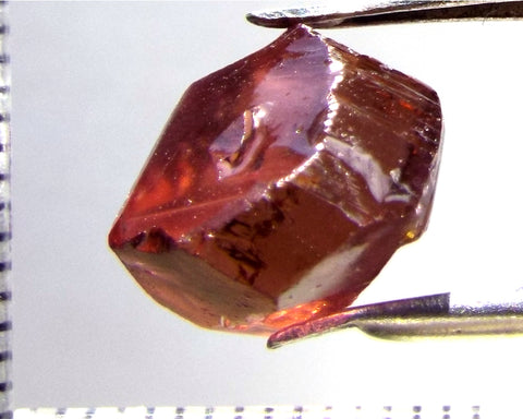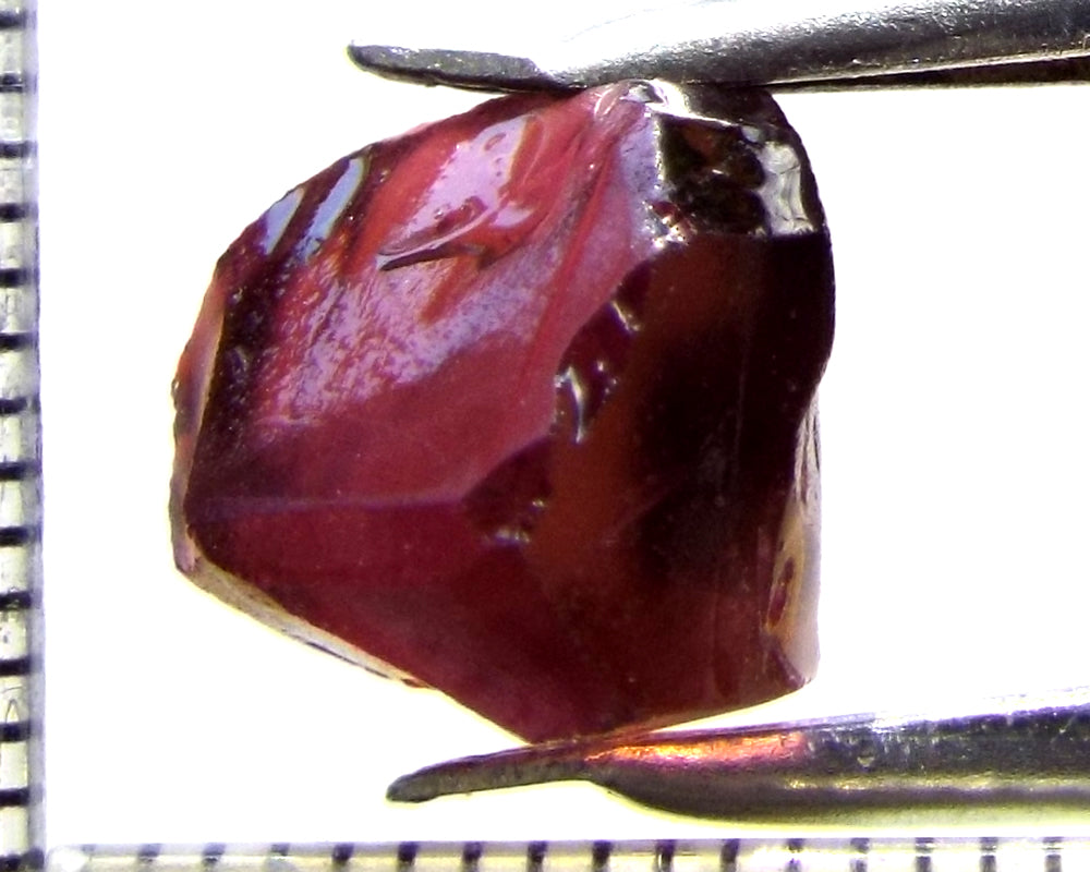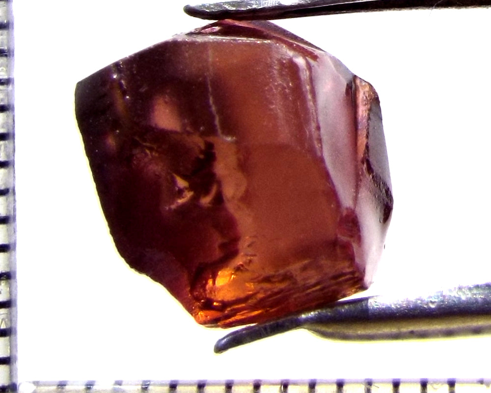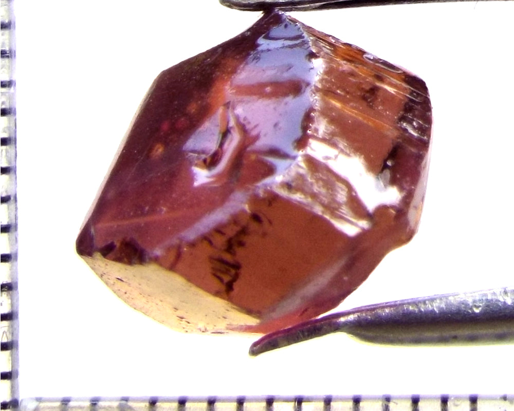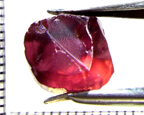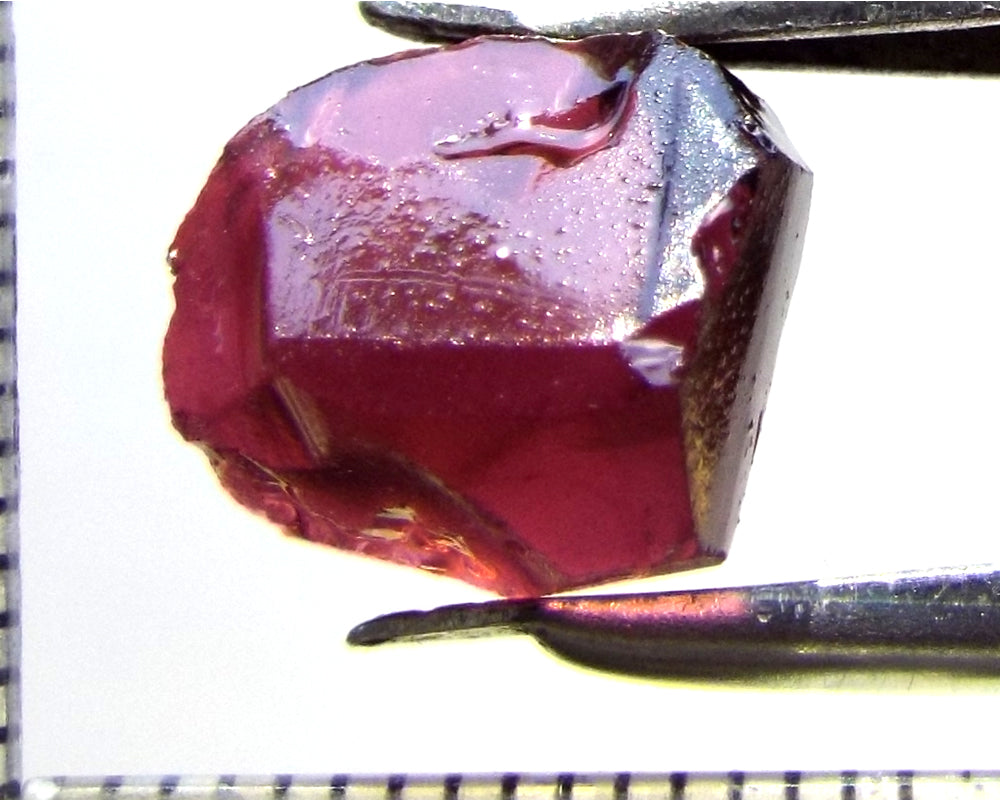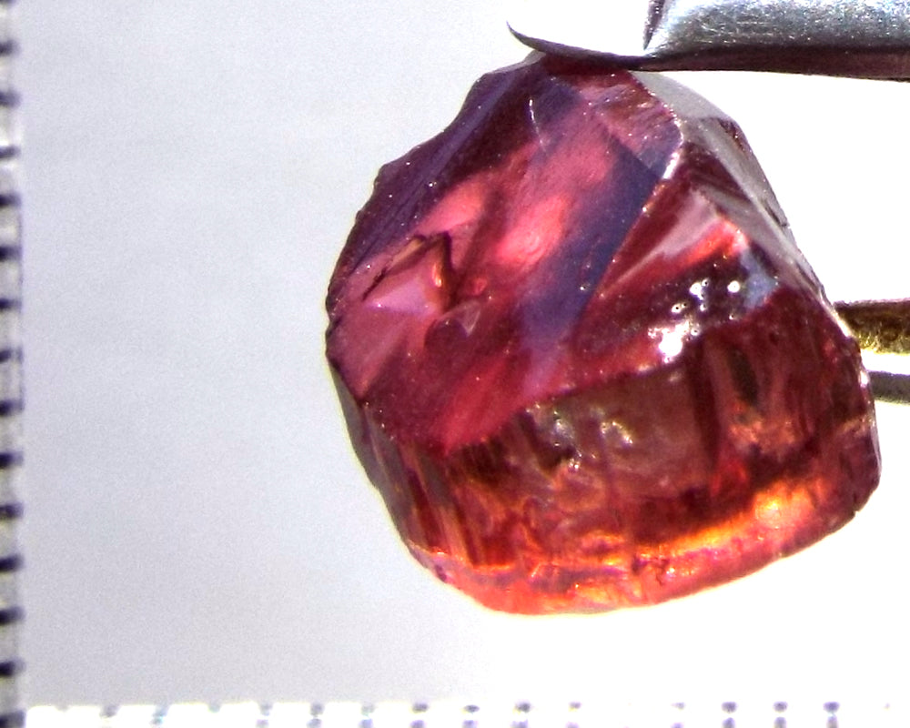 A bright rich, medium-strong pink-purple stone from Mozambique, showing a lighter tone on the "A" axes and a stronger colour down the "C" axis. The stone, weighing 9.47 cts, has been ground or cobbed clean and is graded AAA.