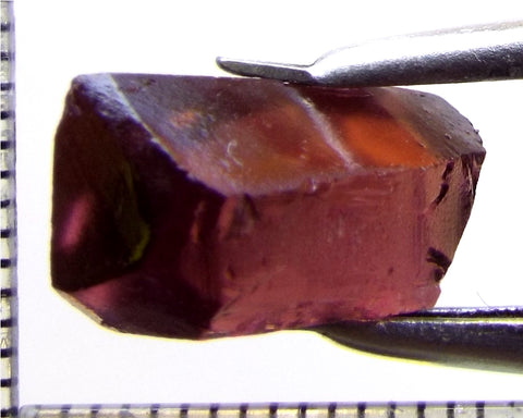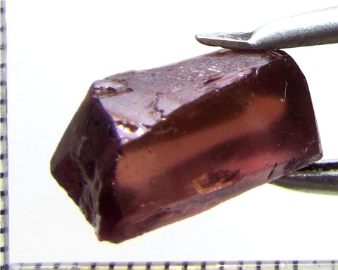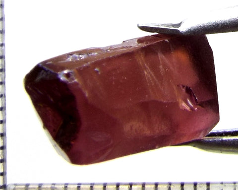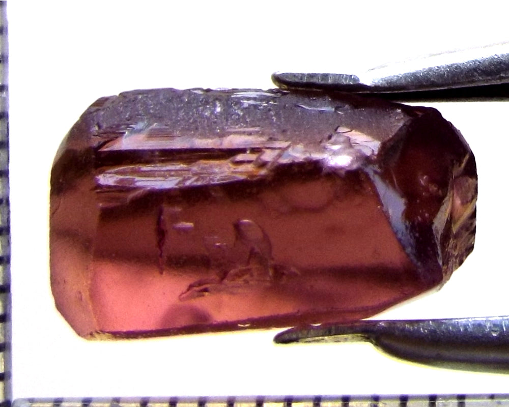 A bright rich, medium-strong pink-purple stone from Mozambique, showing a lighter tone on the "A" axes and a stronger colour down the "C" axis. The stone, weighing 9.80 cts, has been ground or cobbed clean and is graded AAA.