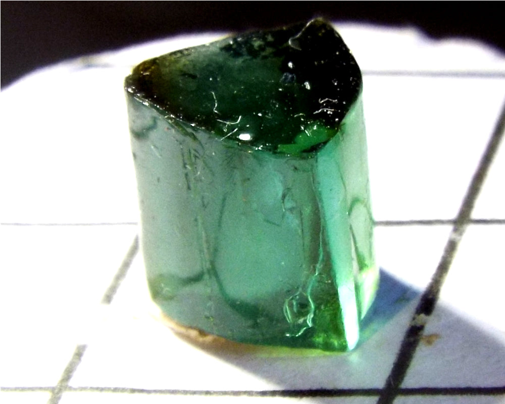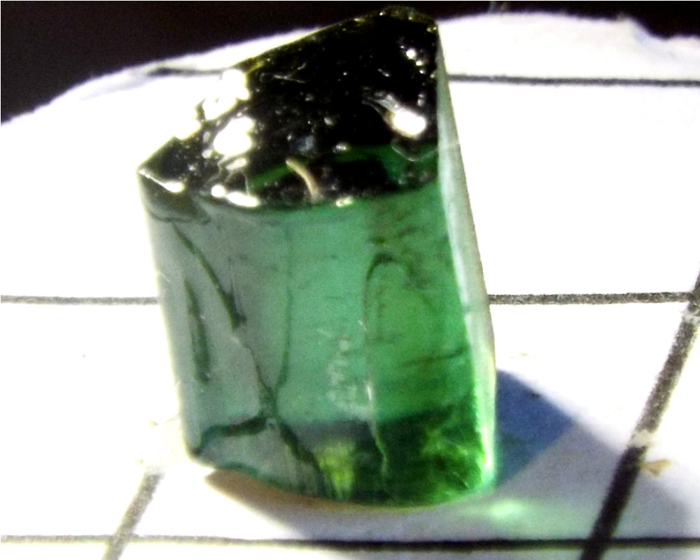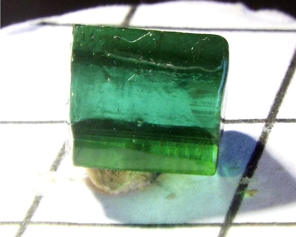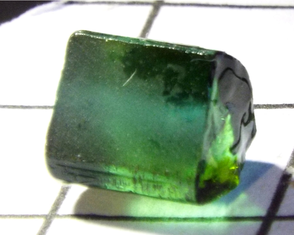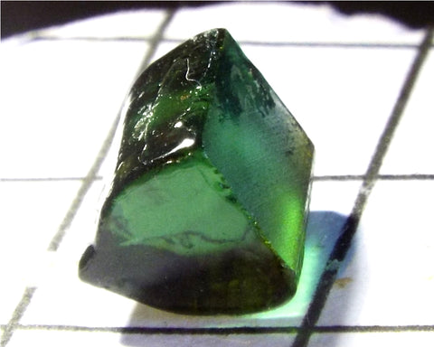Tourmaline – Nigeria – 3.43 cts - Ref. TOB-819 A bright medium green stone from Nigeria, semi-open'C' axis. Graded AAA and weighing 3.43cts. Priced at just $6.00 per carat, a total of $21.00 The grid shown is in 10mm squares. Now beat that for value!