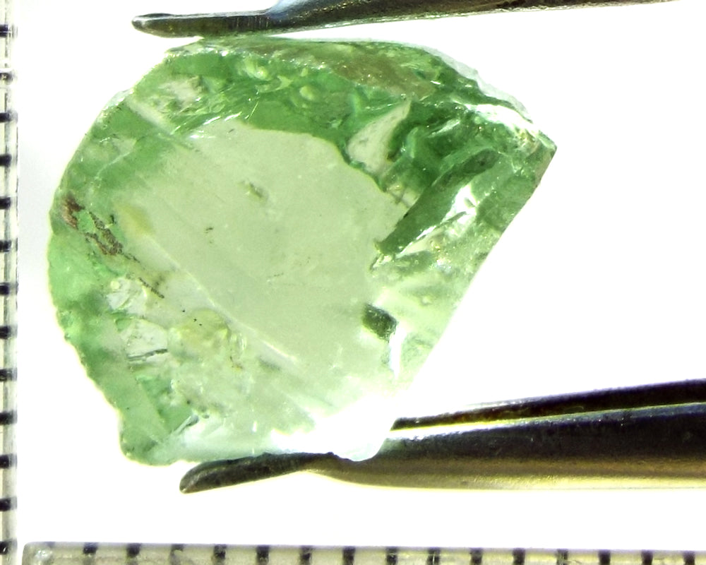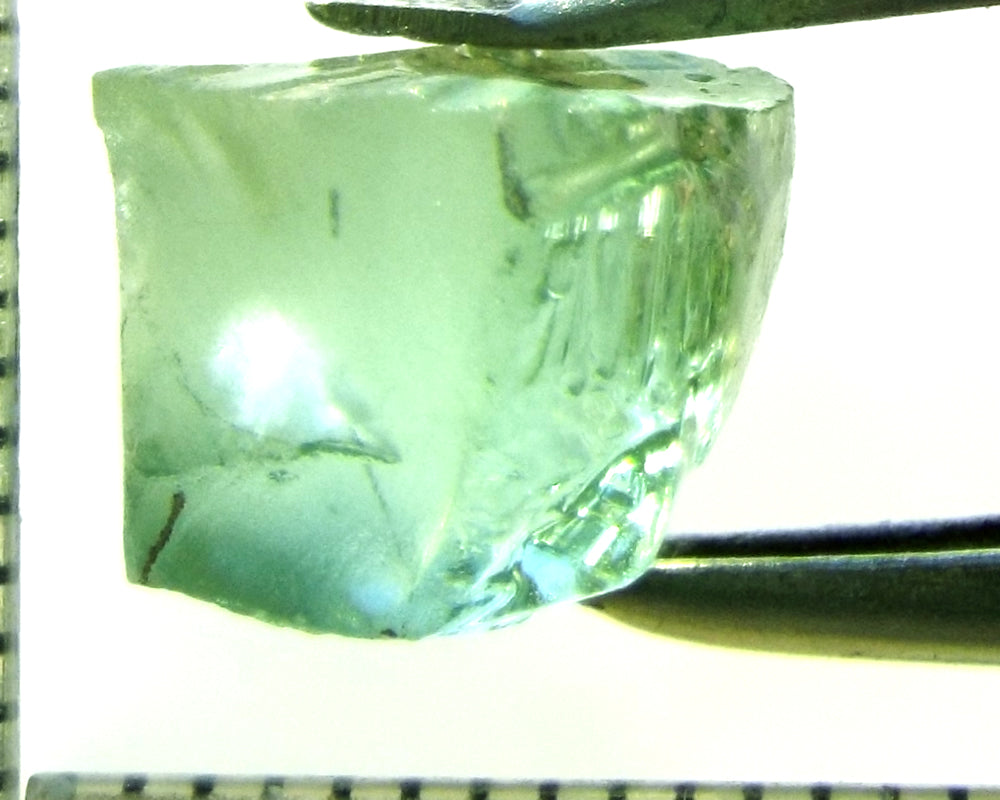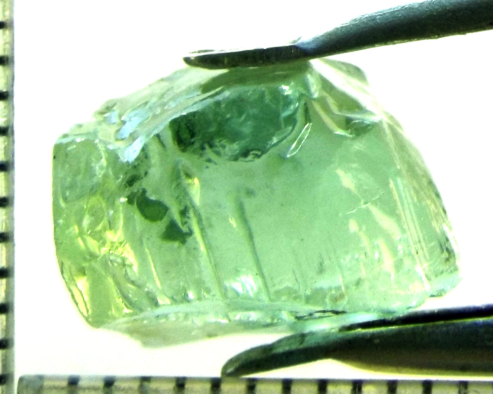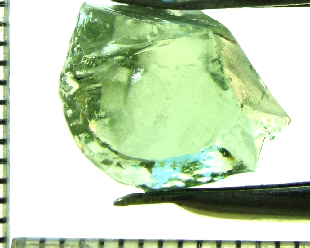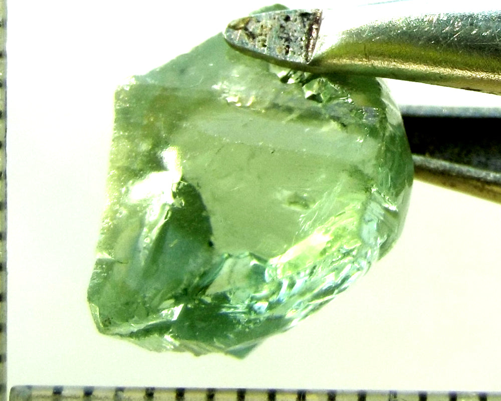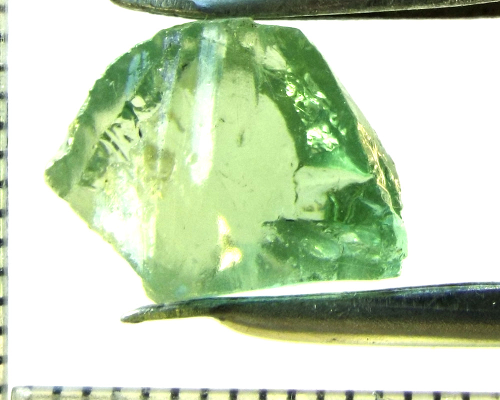 A bright medium-light mint-green, slightly yellow stone with a touch of blue from Mozambique, showing a blue-green 'C' axis.