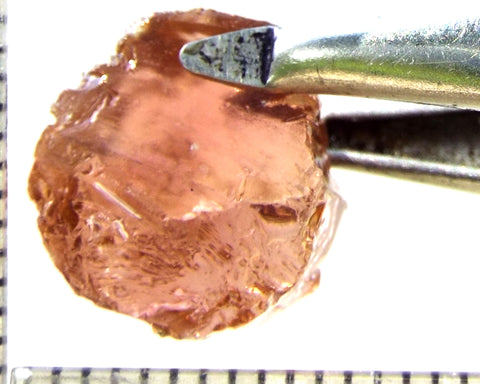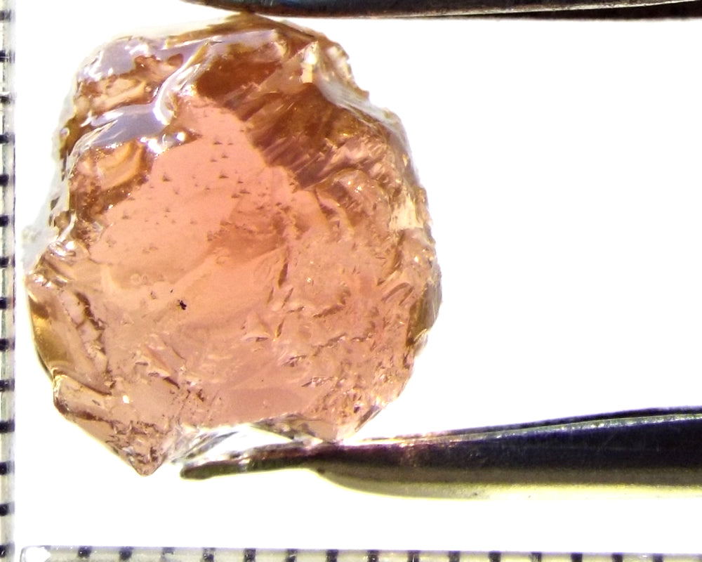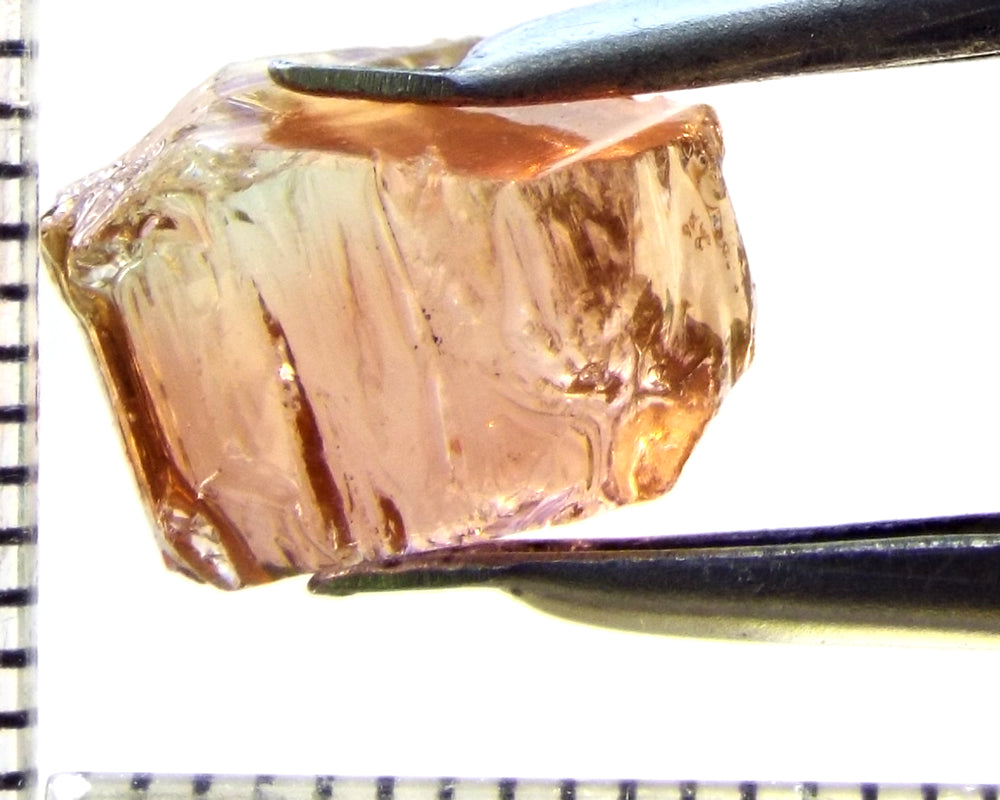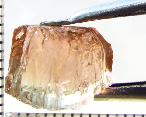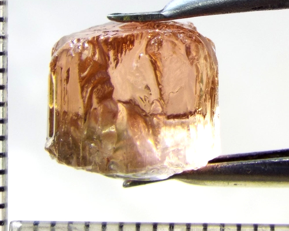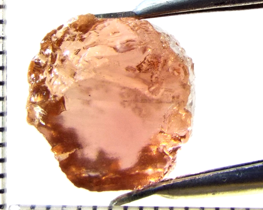 Tourmaline – Mozambique– 9.68 cts - Ref. TOB-584 A bright medium orange-pink stone from Mozambique, showing a deeper colour through the 'C' axes. Graded AAA and weighing 9.68cts. Priced at just $10.00 per carat, a total of $97.00 The scale shown is in millimetres Now beat that for value!