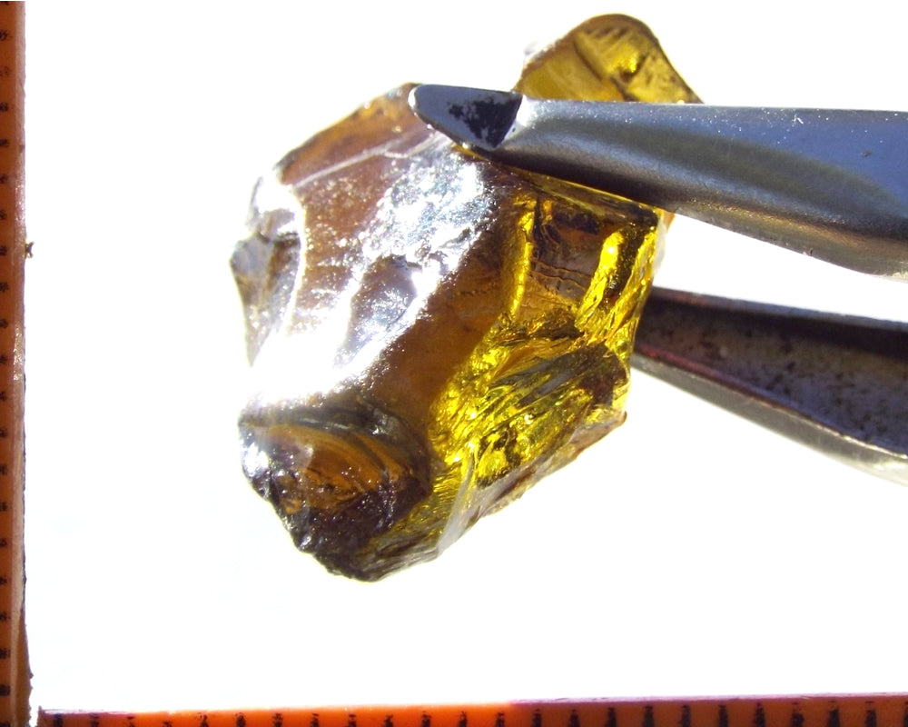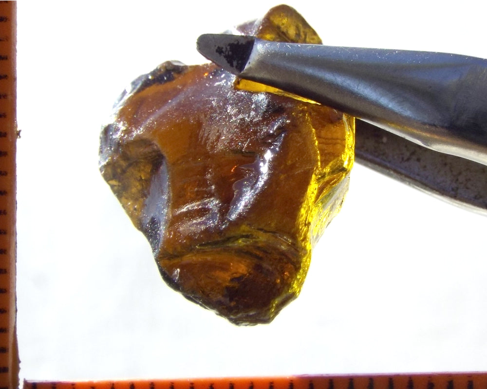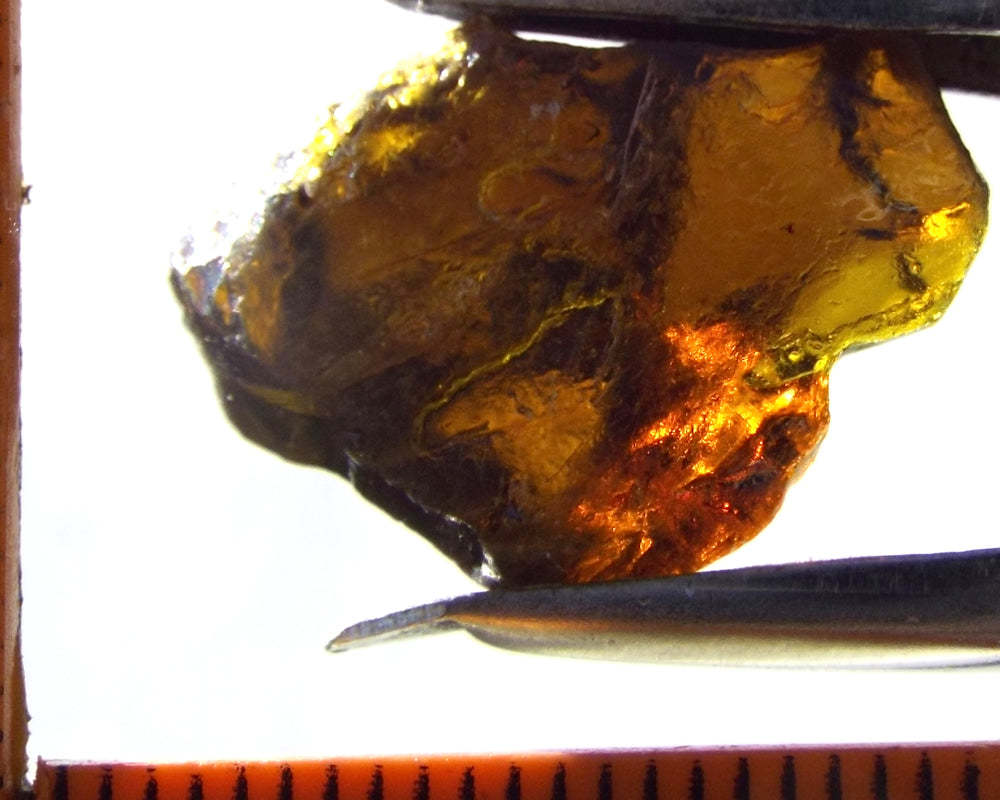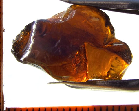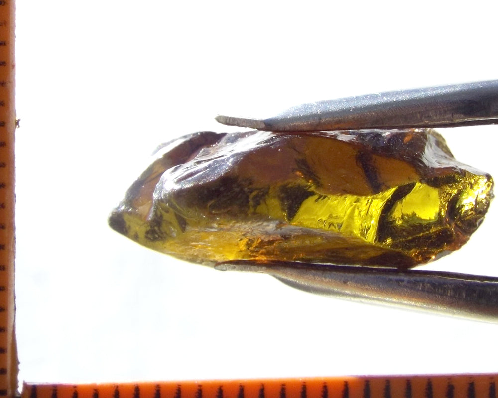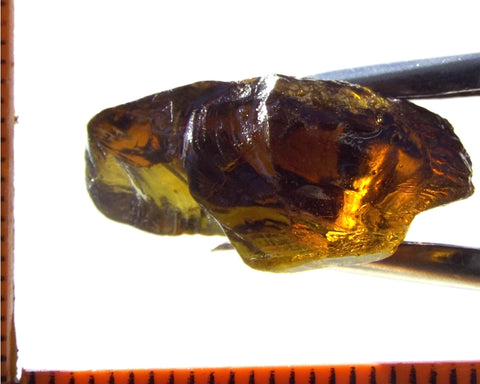 An interesting strong ‘burnt orange’ 'C' axis stone with lighter green "A" axes, from Tanzania. These stones have been referred to as "Sunset" tourmalines as the colour varies from greens to yellows to browns and all colour variations in between. Strongly dichroic, it is sometimes possible to incorporate the two colours in the cut stone with unusual results.