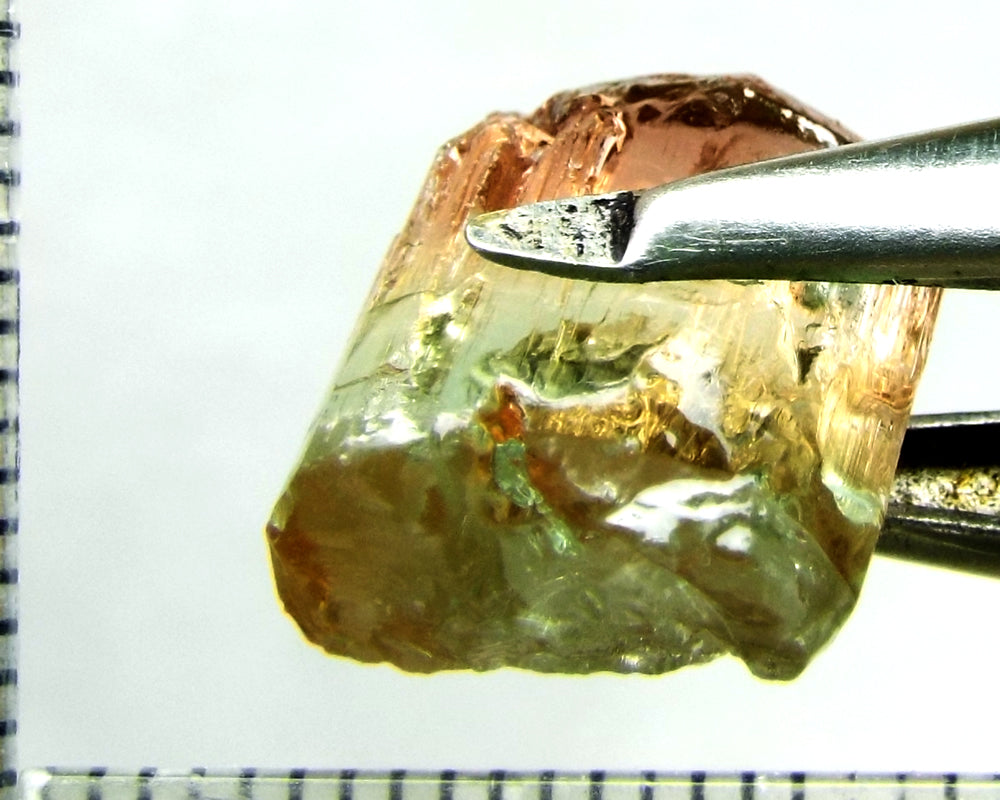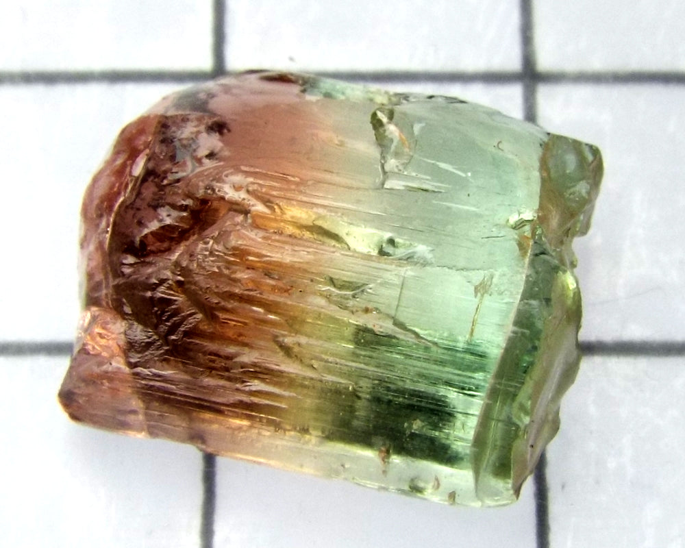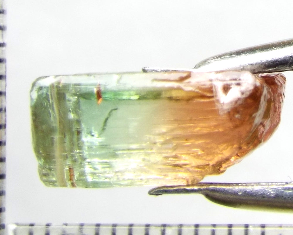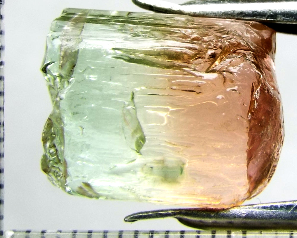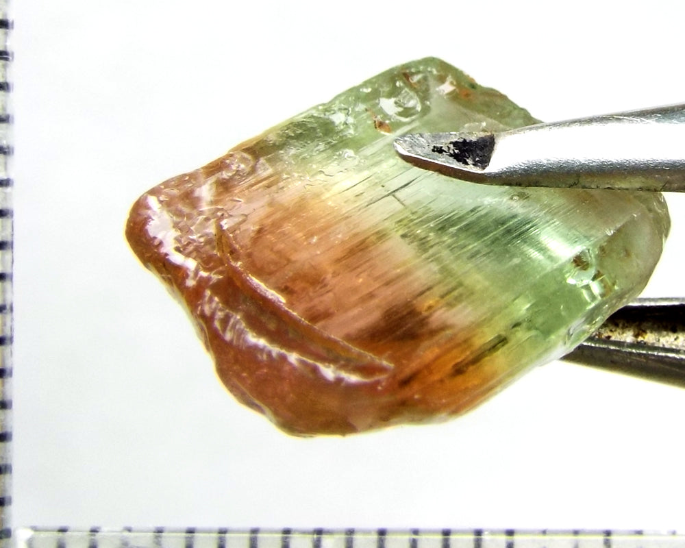 A superb tri-colour stone from Mozambique, showing medium-light green, yellow-green and darker pink well-defined colours down the length of the crystal.