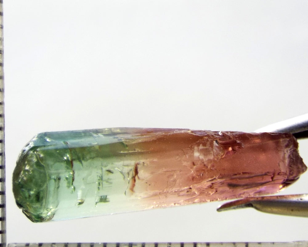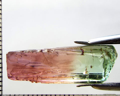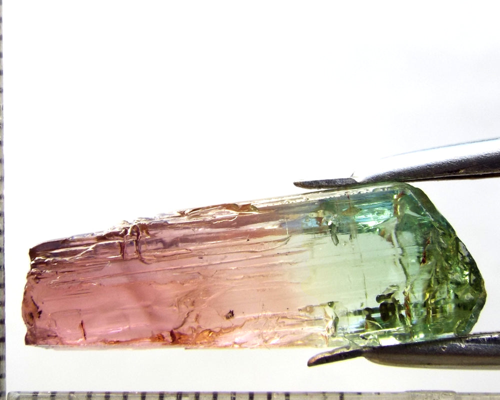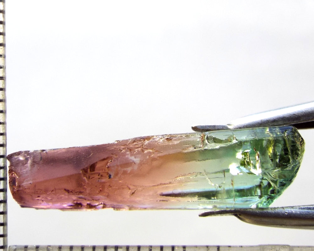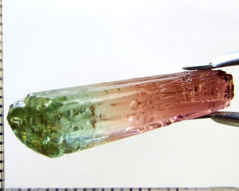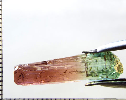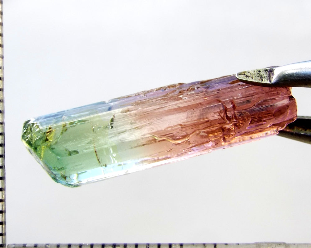 A superb tri-colour stone from Mozambique, showing medium-light green, yellow-green and darker pink well-defined colours down the length of the crystal.