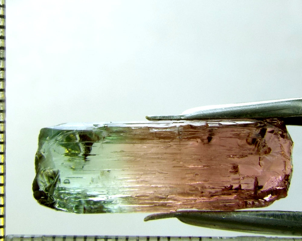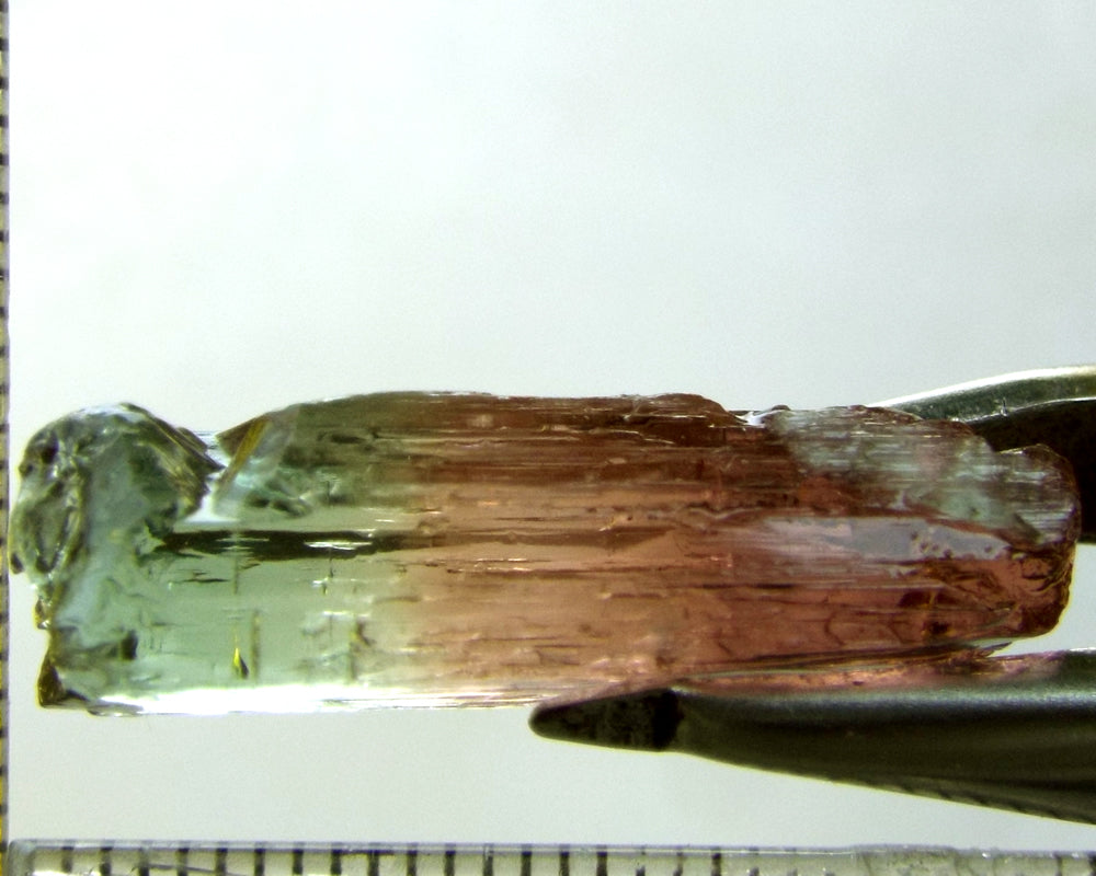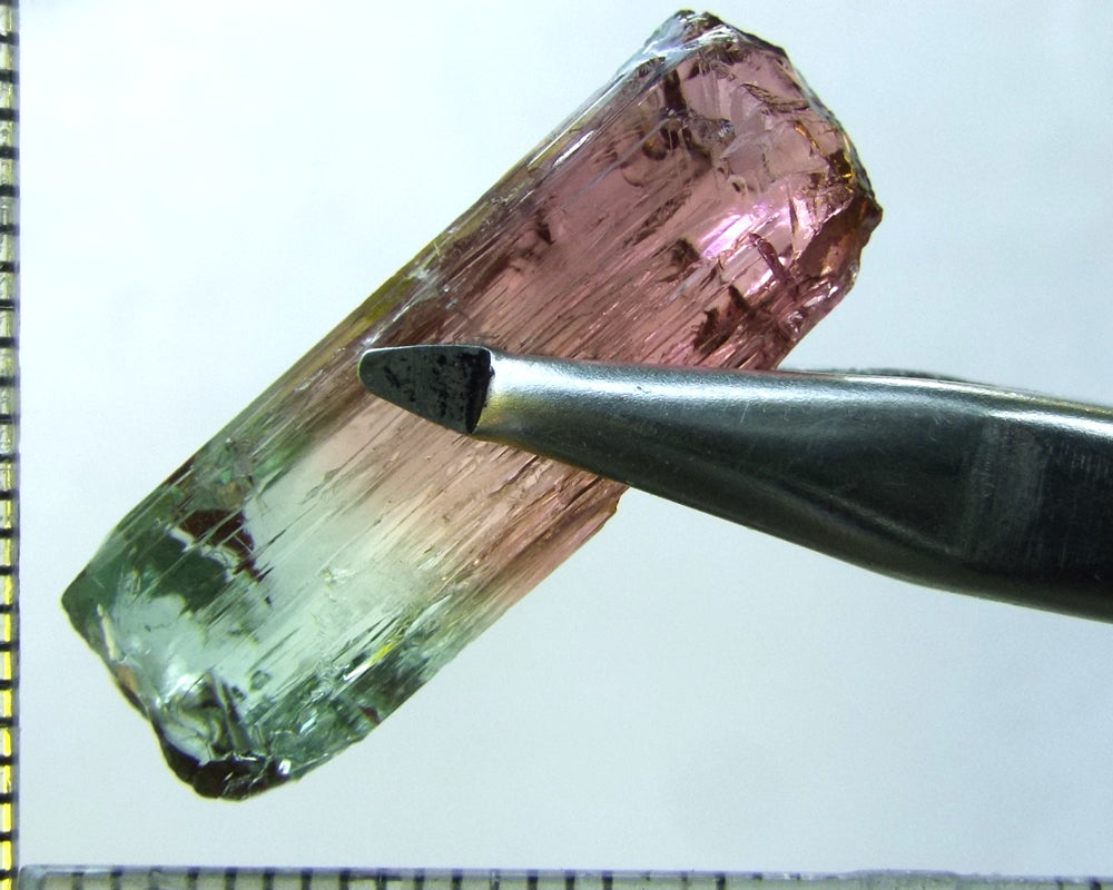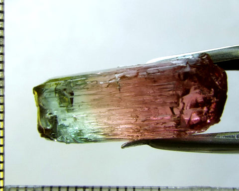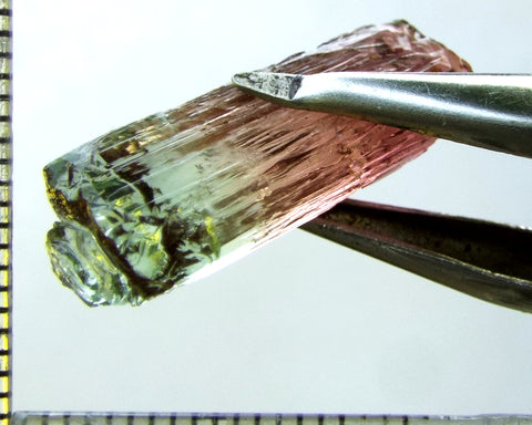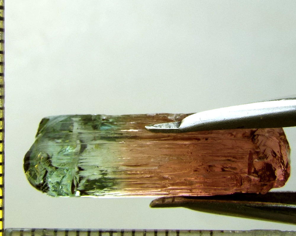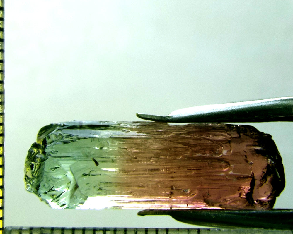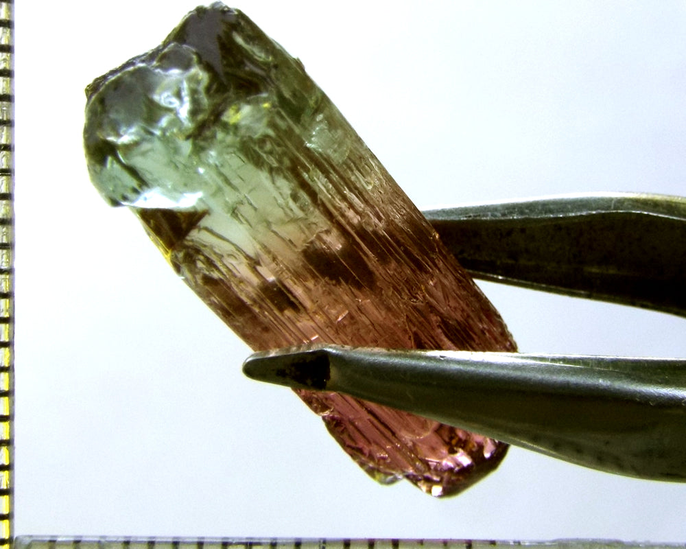 A superb tri-colour stone from Mozambique, showing medium-light green, yellow-green and darker pink well-defined colours down the length of the crystal.