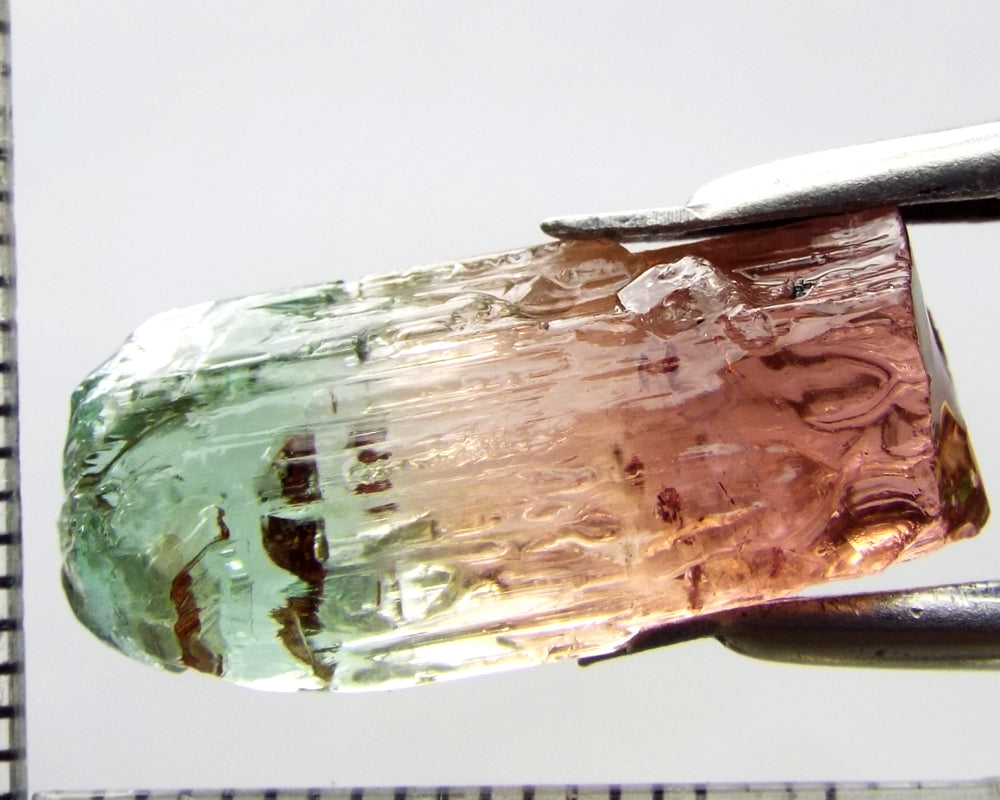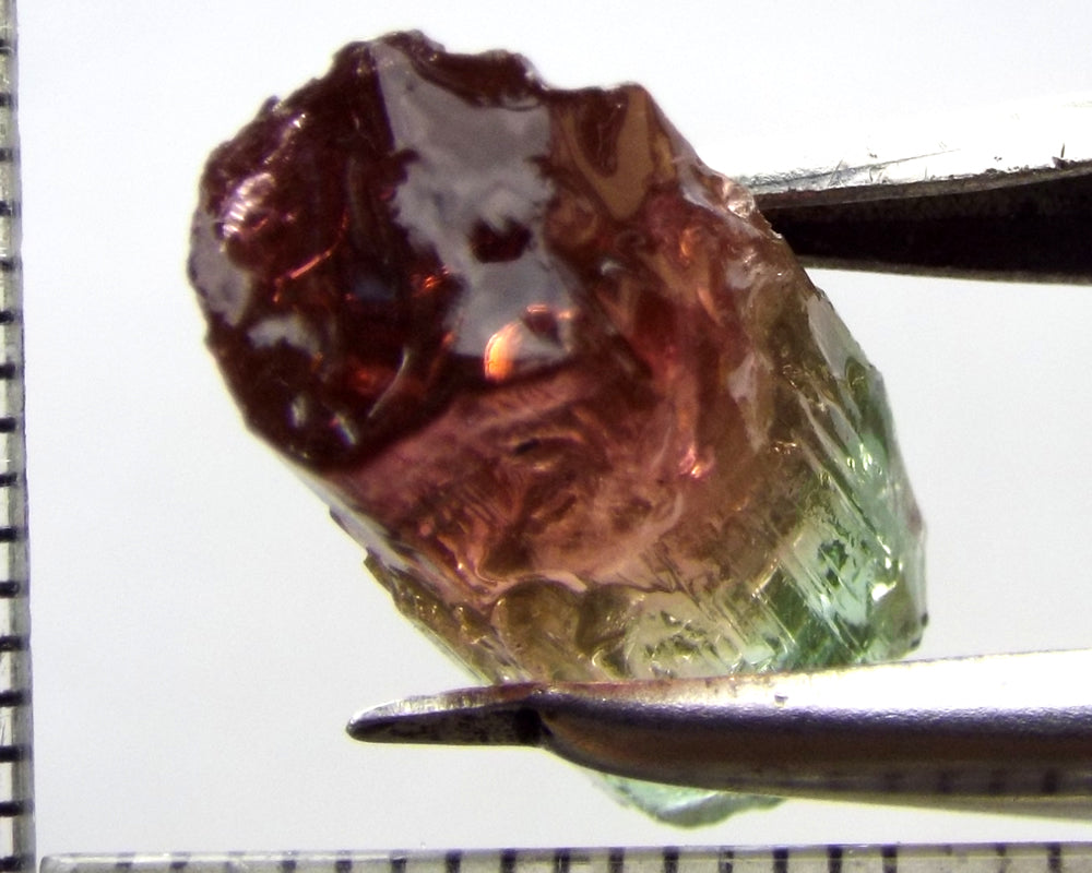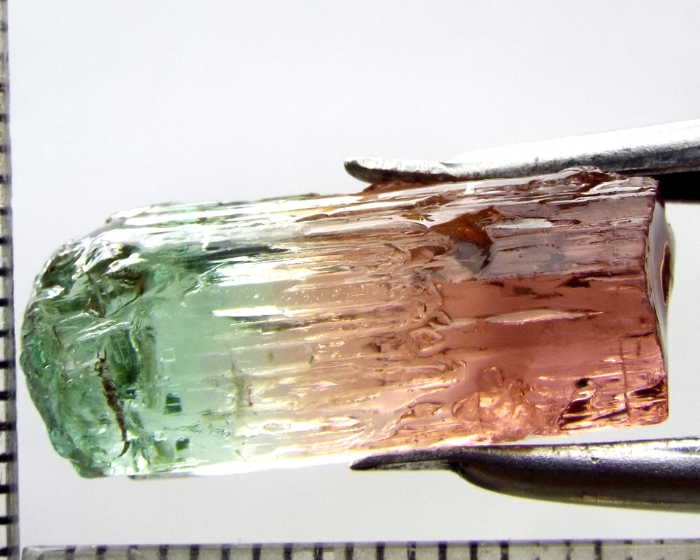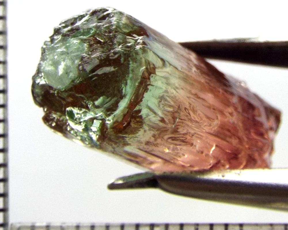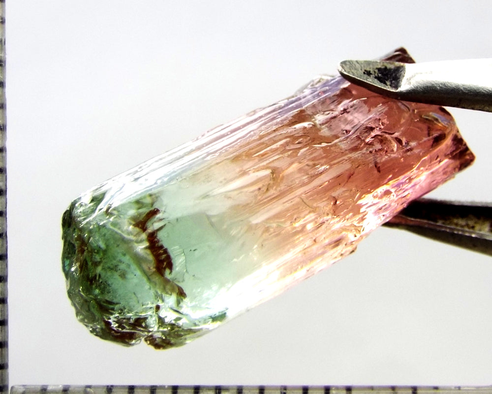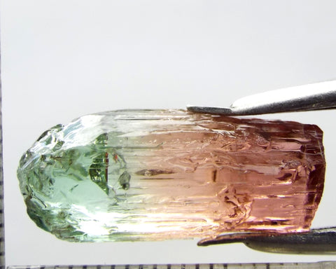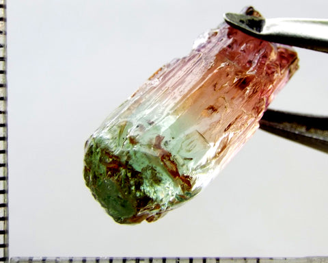 A superb tri-colour stone from Mozambique, showing medium-light green, yellow-green and darker pink well-defined colours down the length of the crystal.