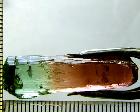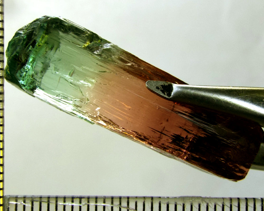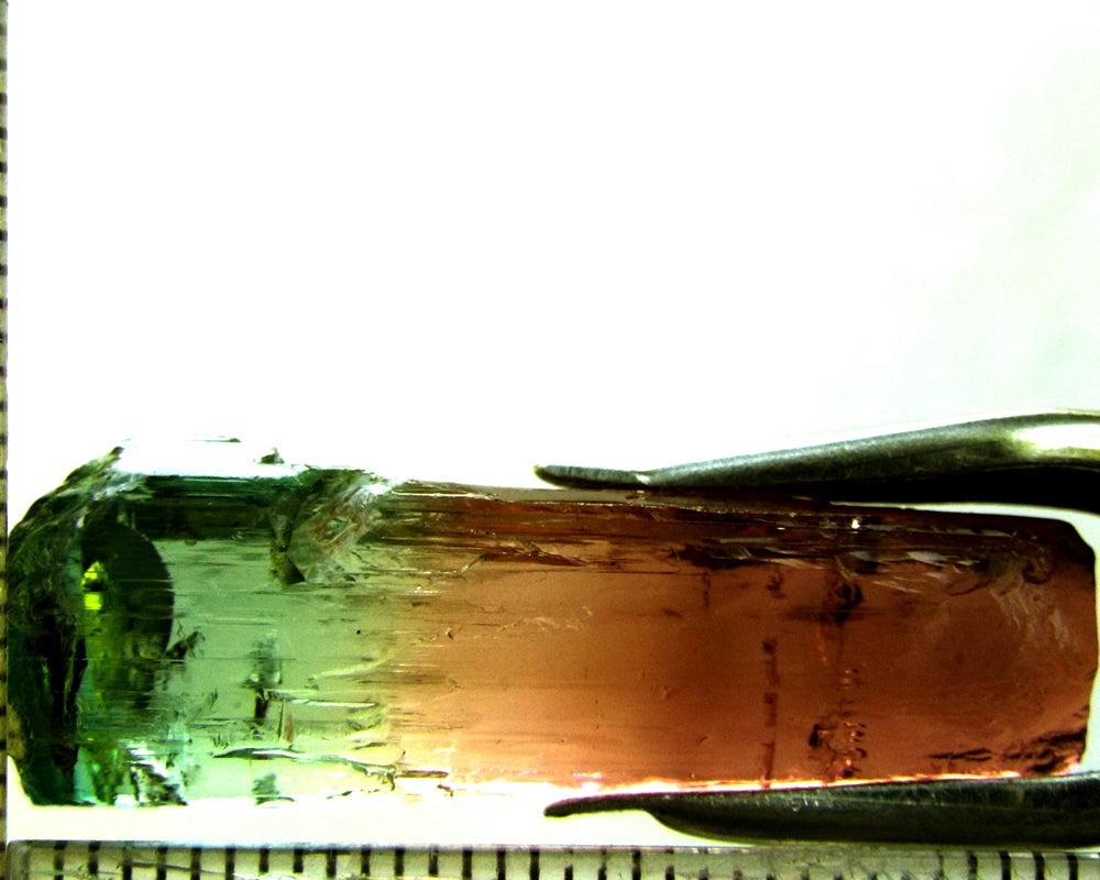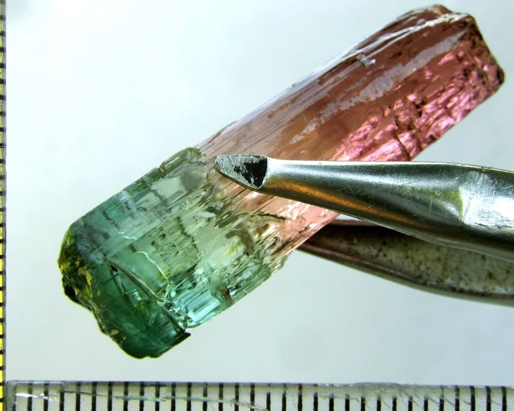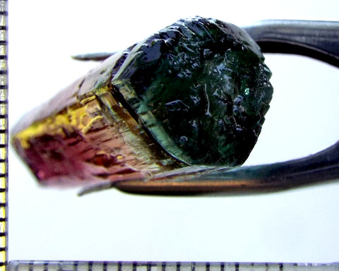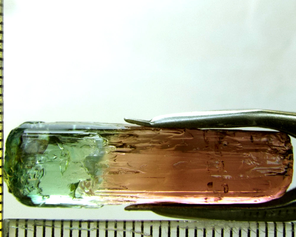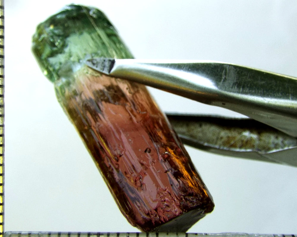 A superb tri-colour stone from Mozambique, showing medium-light green, yellow-green and darker pink well-defined colours down the length of the crystal.