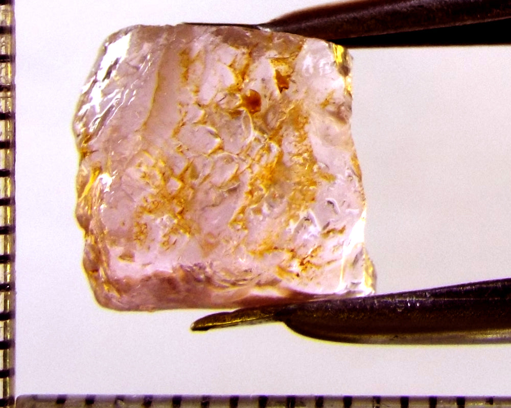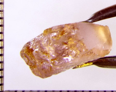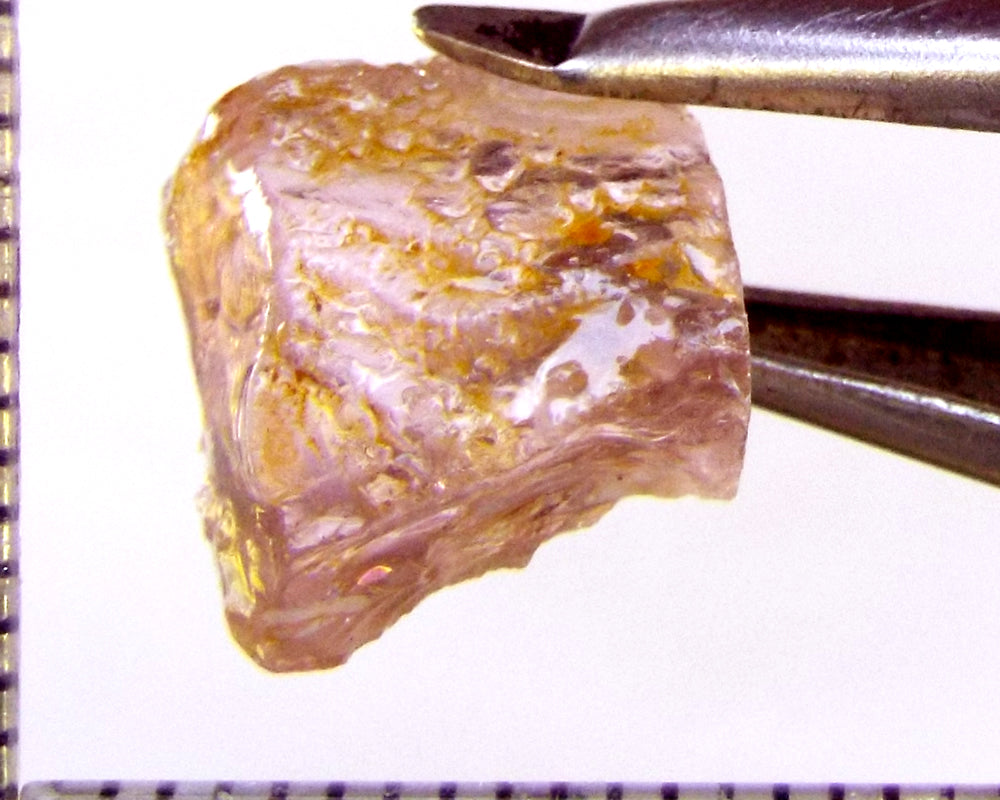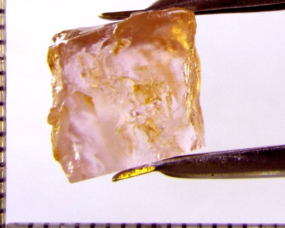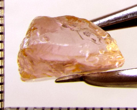 Tourmaline – Nigeria – 7.04 cts - Ref. TOB-559 A bright light orange-pink stone from Nigeria, showing a similar colour through the 'A' axes. Graded AA+ and weighing 7.04cts. Priced at just $7.00 per carat, a total of $49.00 The scale shown is in millimetres Now beat that for value!